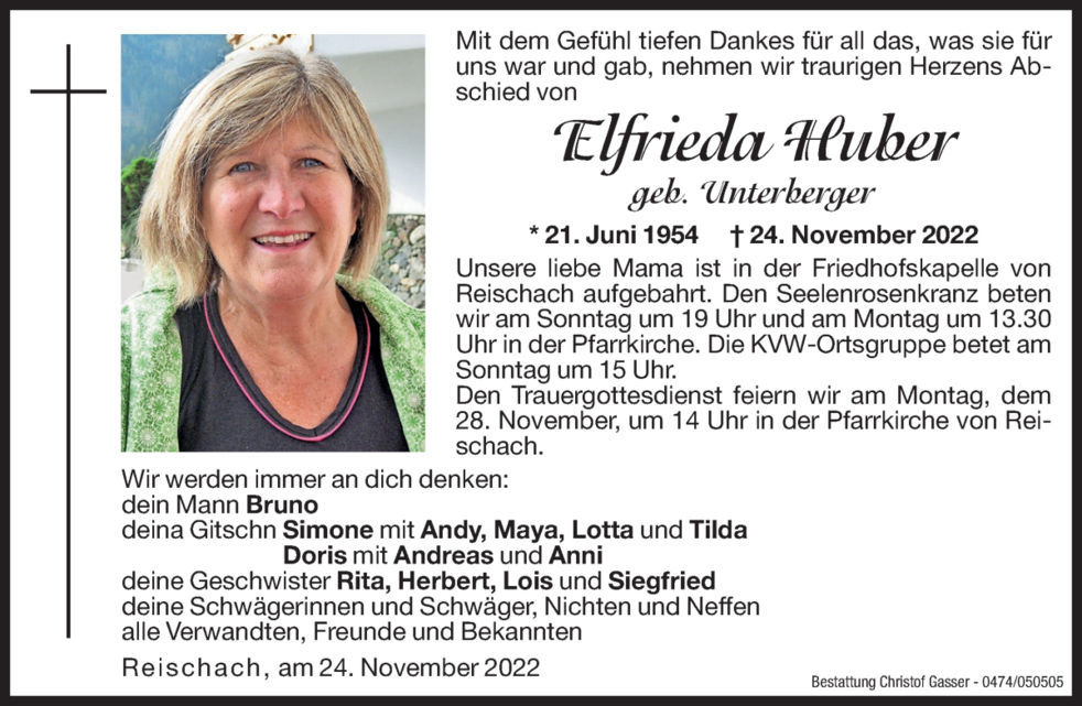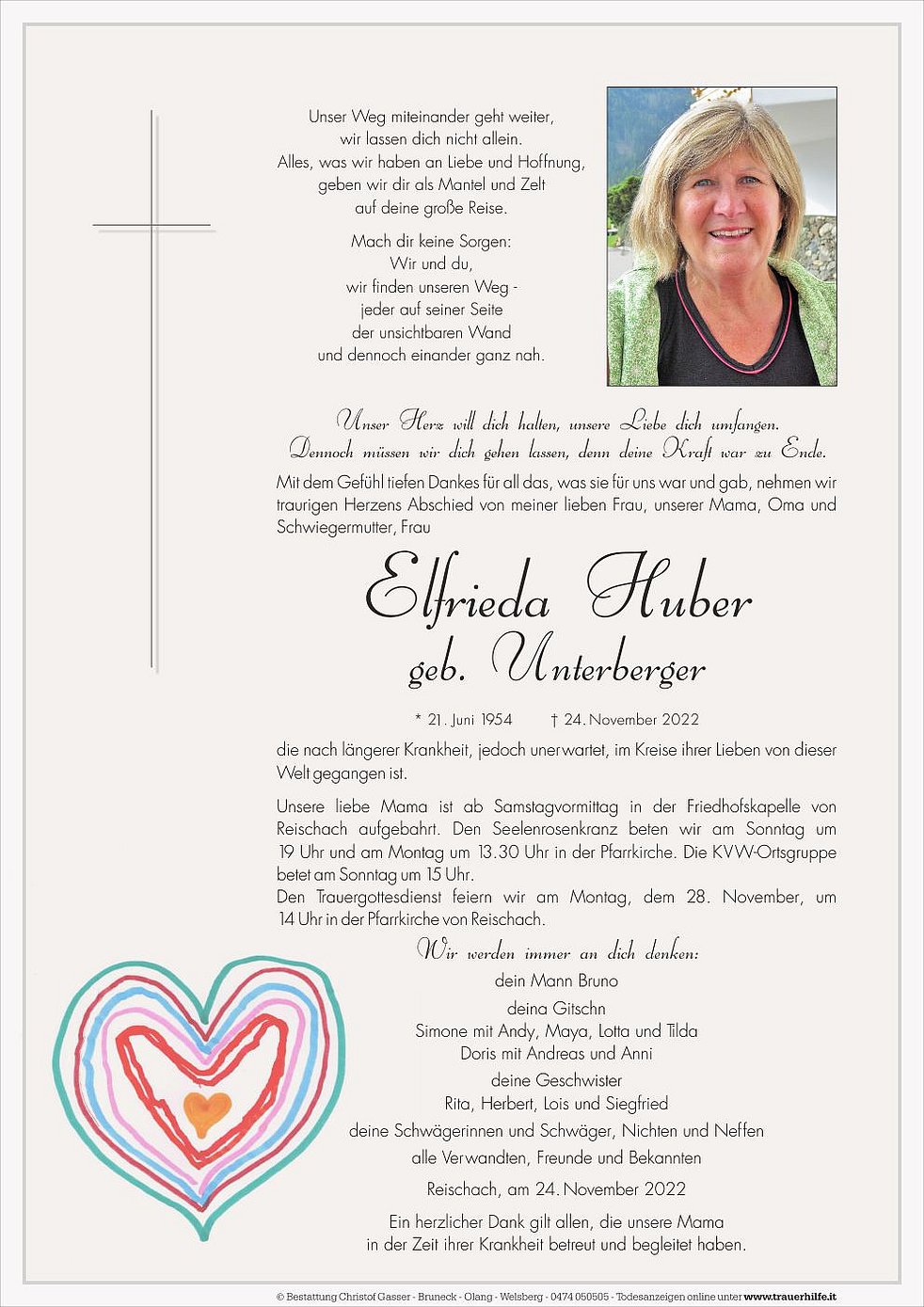 Unsere liebe Mama ist ab Samstagvormittag in der Friedhofskapelle von Reischach aufgebahrt. Den Seelenrosenkranz beten wir am Sonntag um 19 Uhr und am Montag um 13.30 Uhr in der Pfarrkirche. Die KVW-Ortsgruppe betet am Sonntag um 15 Uhr.