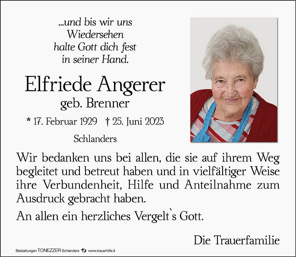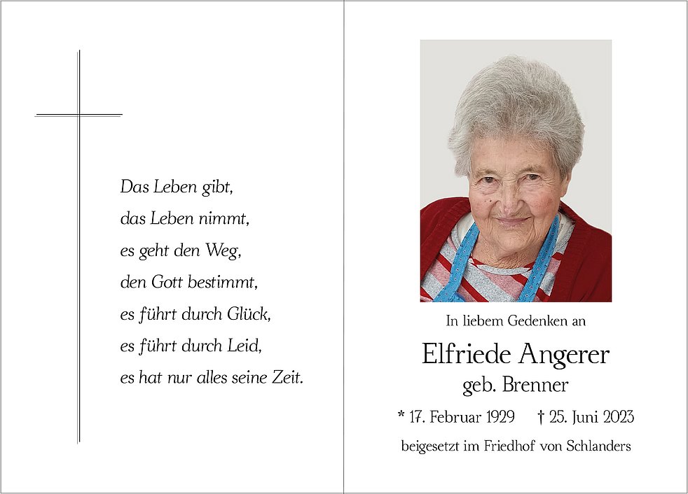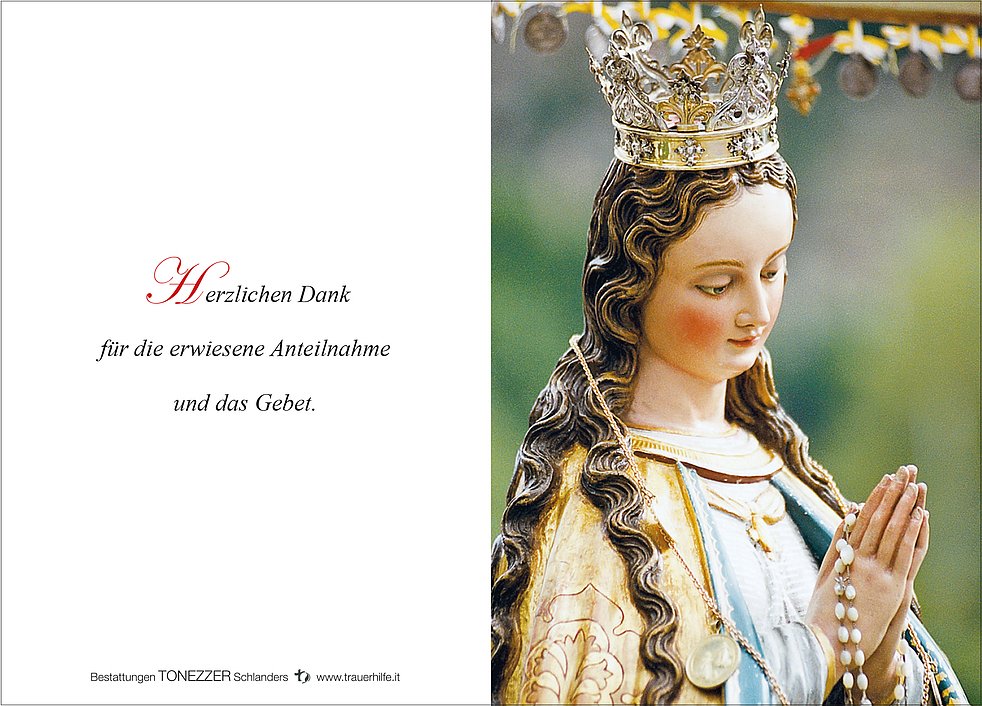 Am Donnerstag, 29. Juni, um 13.30 Uhr beten wir den Rosenkranz; um 14 Uhr feiern wir den Begräbnisgottesdienst mit anschließender Verabschiedung in der Pfarrkirche von Schlanders.
