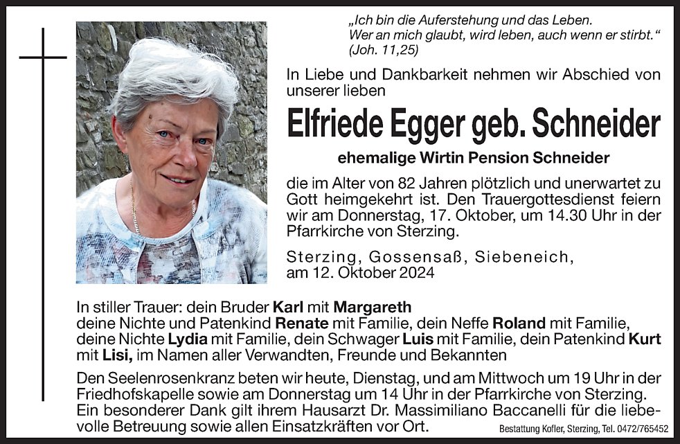 Den Trauergottesdienst feiern wir am Donnerstag, 17. Oktober, um 14.30 Uhr in der Pfarrkirche von Sterzing. Die Urnenbeisetzung findet zu einem späteren Zeitpunkt im engsten Familienkreis statt.