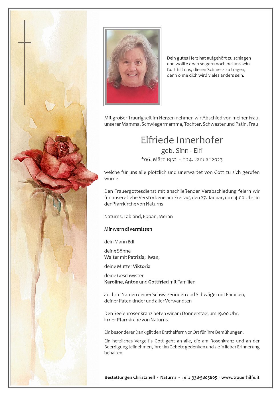 Den Trauergottesdienst mit anschließender Verabschiedung feiern wir für unsere liebe Verstorbene am Freitag, den 27. Januar, um 14.00 Uhr, in der Pfarrkirche von Naturns.