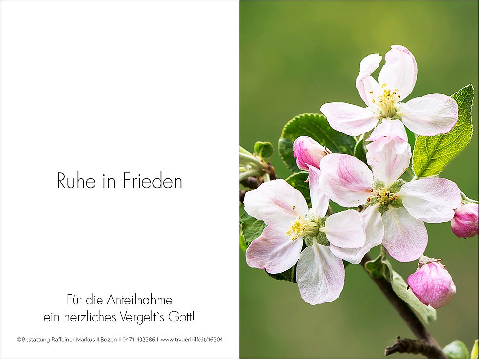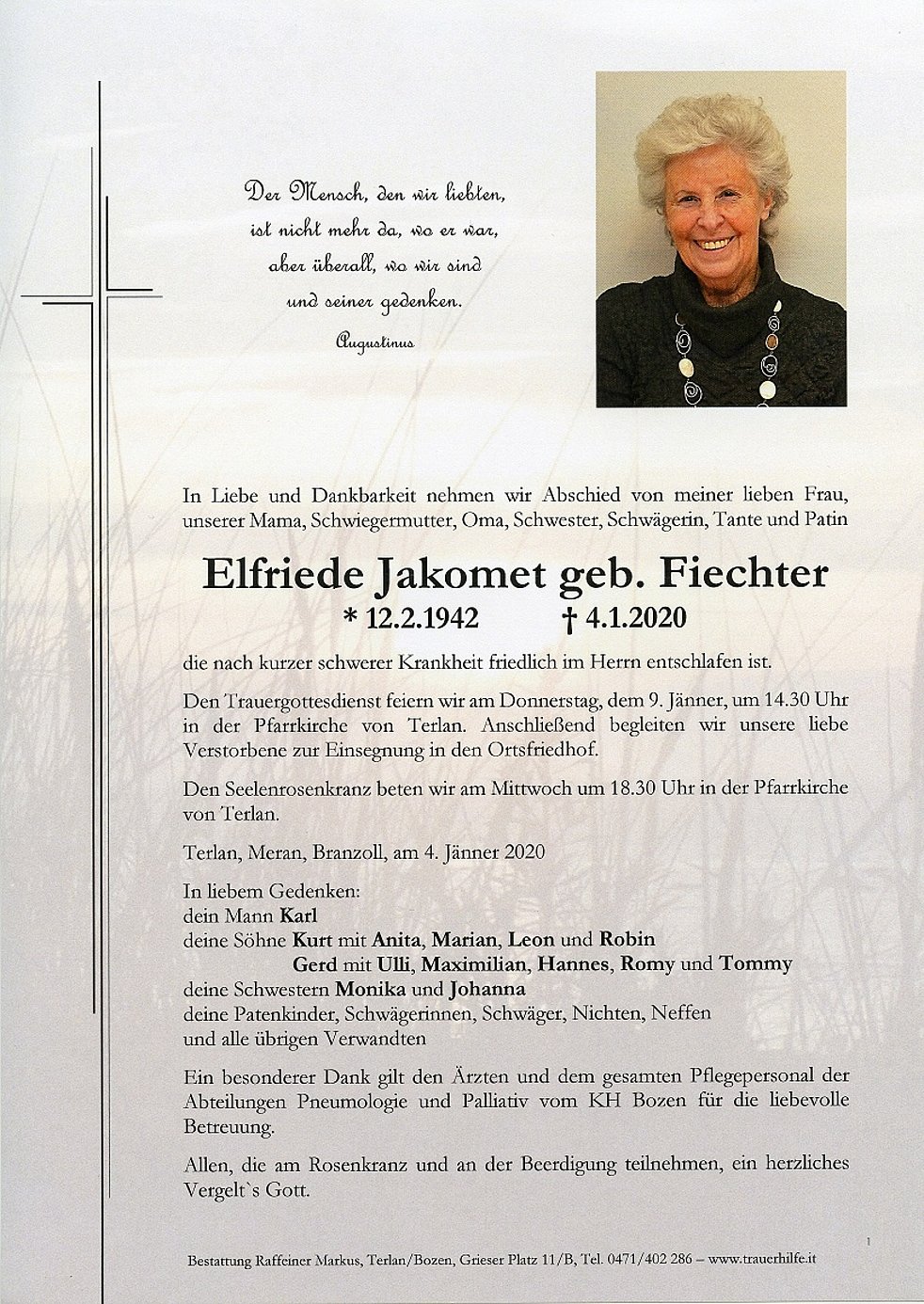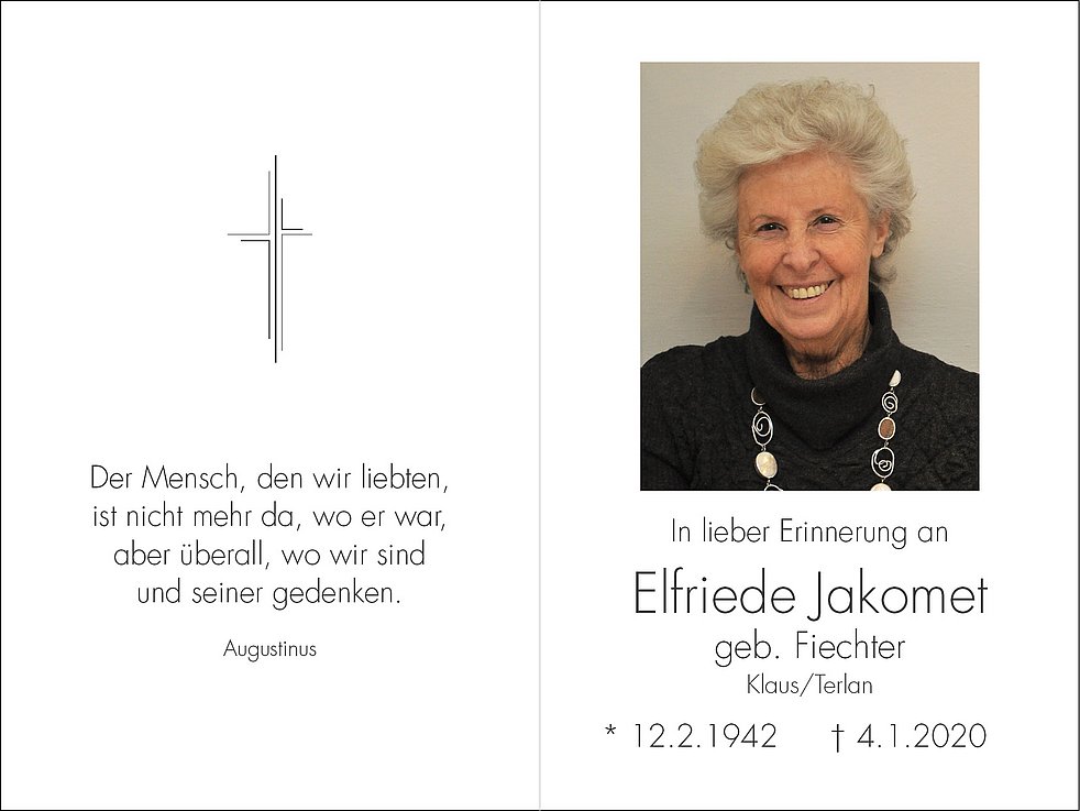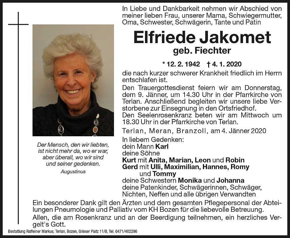 Den Trauergottesdienst feiern wir am Donnerstag, dem 9. Jänner, um 14.30 Uhr in der Pfarrkirche von Terlan. Anschließend begleiten wir unsere liebe Verstorbene zur Einsegnung in den Ortsfriedhof.
