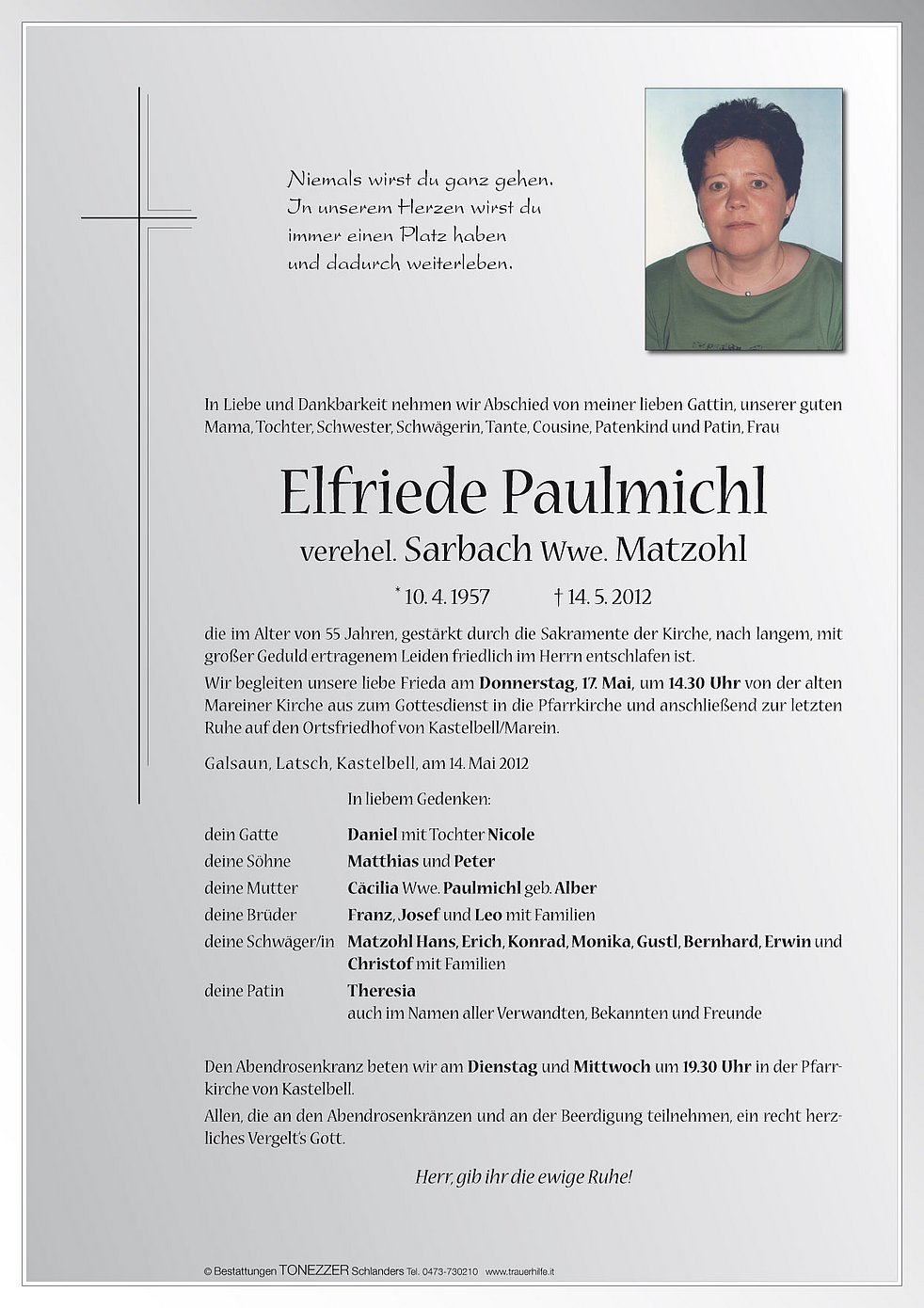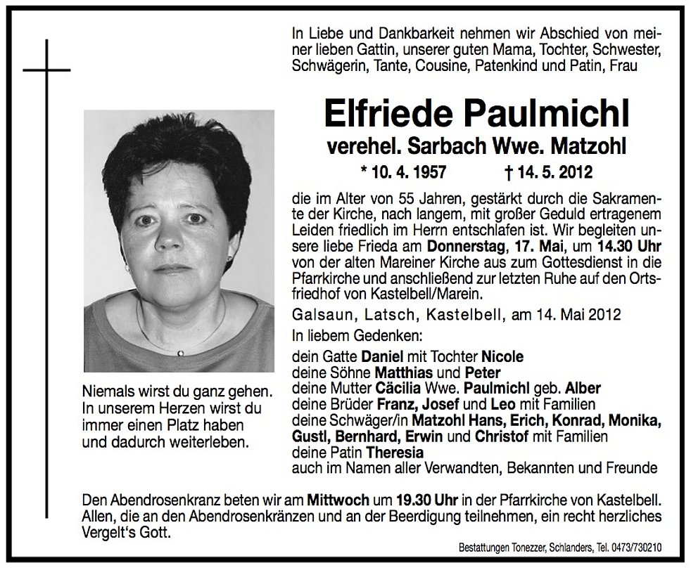Wir begleiten unsere liebe Frieda am Donnerstag, 17. Mai, um 14.30 Uhr von der alten Mareiner Kirche aus zum Gottesdienst in die Pfarrkirche und anschließend zur letzten Ruhe auf den Ortsfriedhof von Kastelbell/Marein.