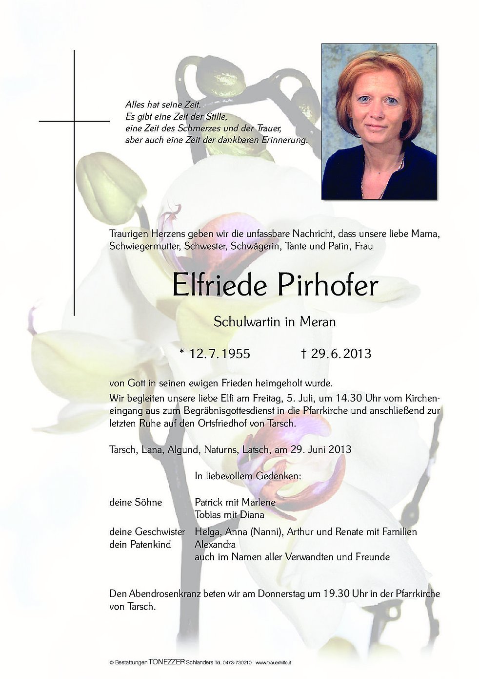 Wir begleiten unsere liebe Elfi am Freitag, 5. Juli, um 14.30 Uhr von Kircheneingang aus zum Begräbnisgottesdienst in die Pfarrkirche und anschließend zur letzten Ruhe auf den Ortsfriedhof von Tarsch.