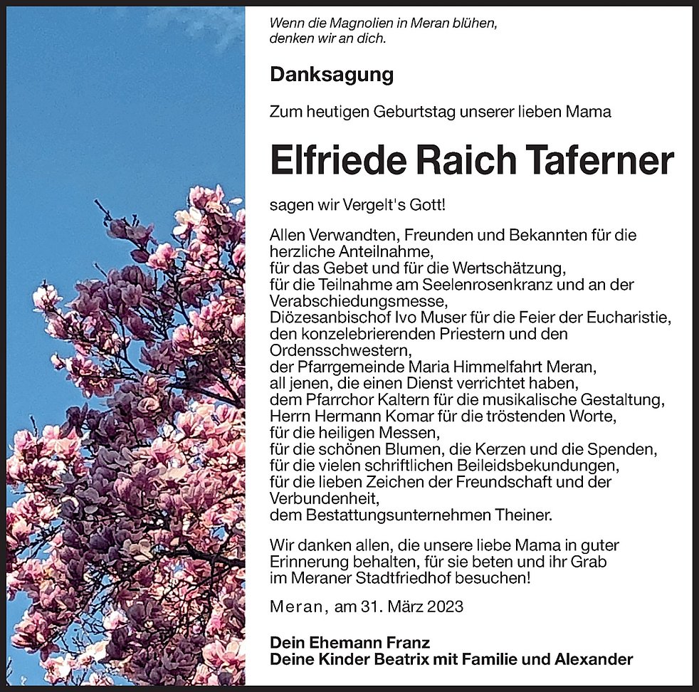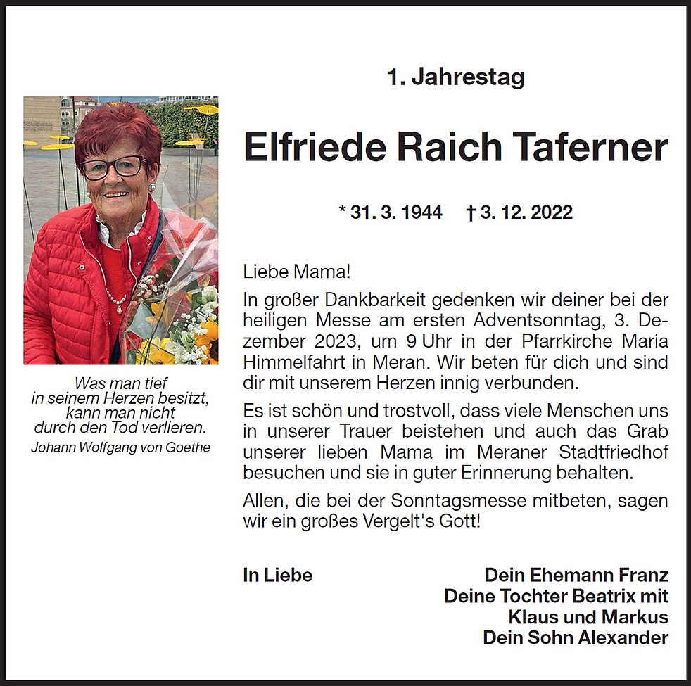 Ein großes Vergelt`s Gott sagen wir dem Pflege- und Ärzteteam der Abteilung Medizin des Meraner Krankenhauses, insbesondere Dr. Grimm, Dr. Deluca und Dr. Hofer und der Abteilung Palliativ mit Dr. Bellingeri für die fürsorgliche und liebevolle Betreuung.