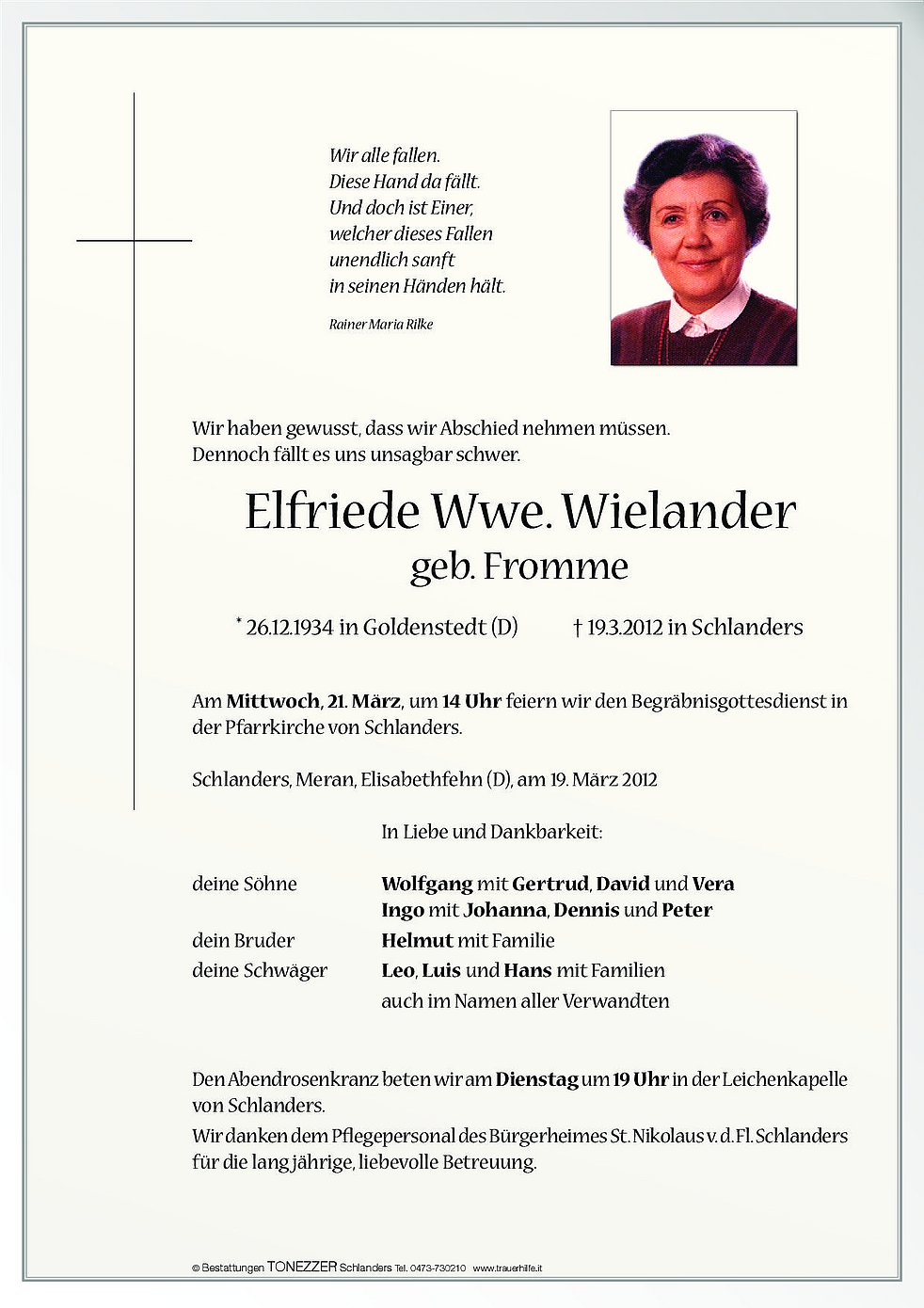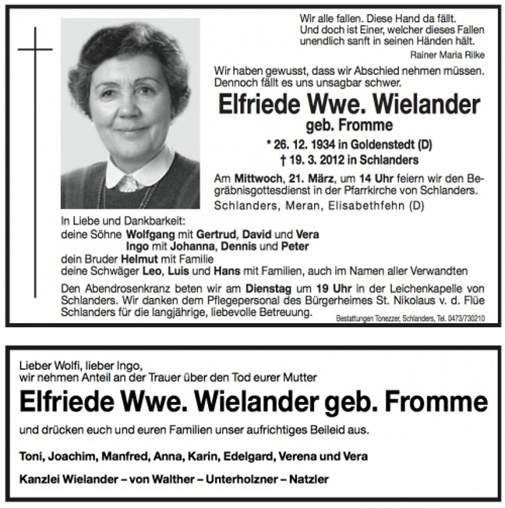 Am Mittwoch, 21. März, um 14 Uhr feiern wir den Begräbnisgottesdienst in der Pfarrkirche von Schlanders.