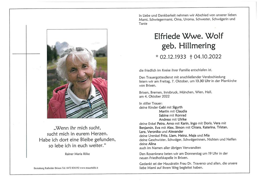 Den Trauergottesdienst mit anschließender Verabschiedung feiern wir am Freitag, 7. Oktober, um 13.30 Uhr in der Pfarrkirche von Brixen.