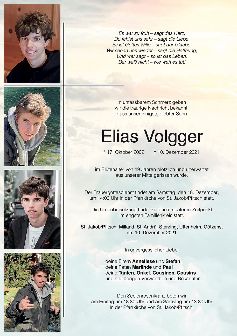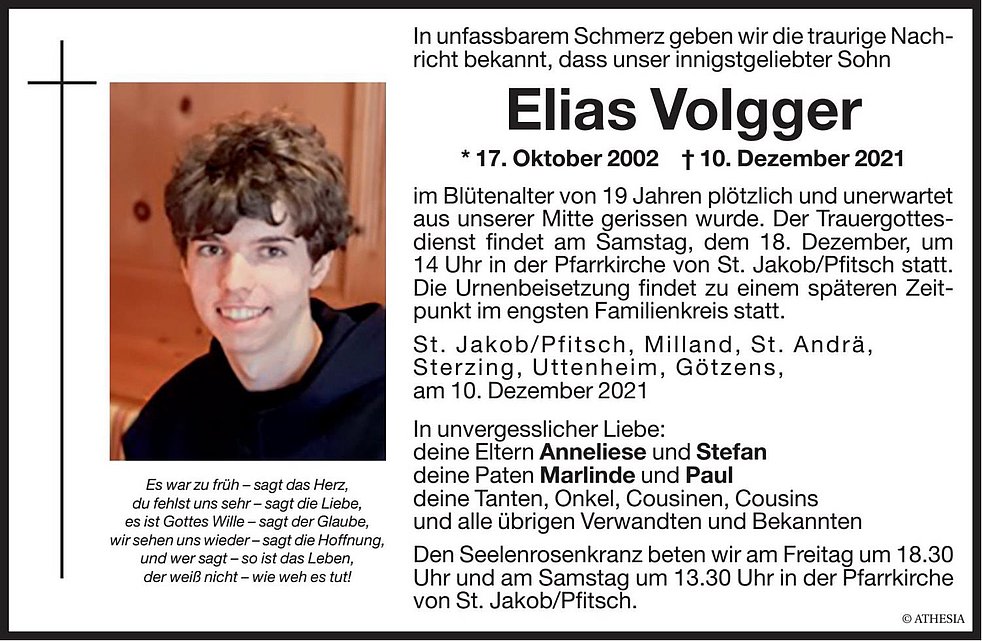 Der Trauergottesdienst findet am Samstag, den 18. Dezember, um 14.00 Uhr in der Pfarrkirche von St. Jakob/Pfitsch statt.