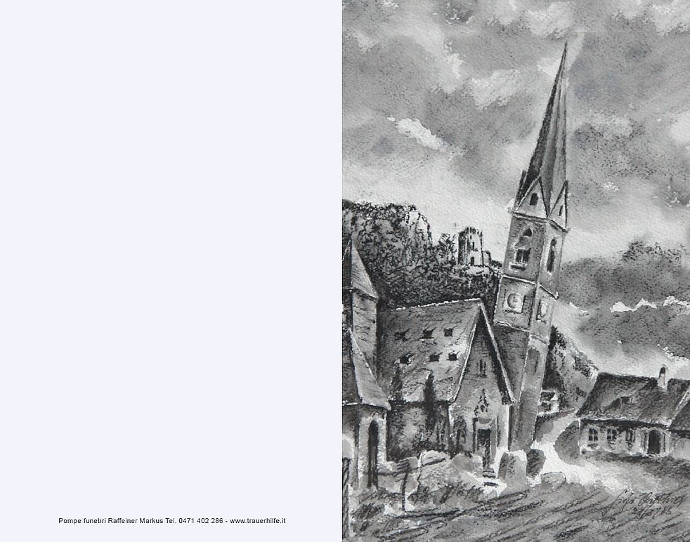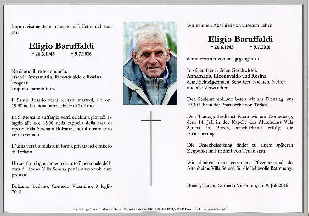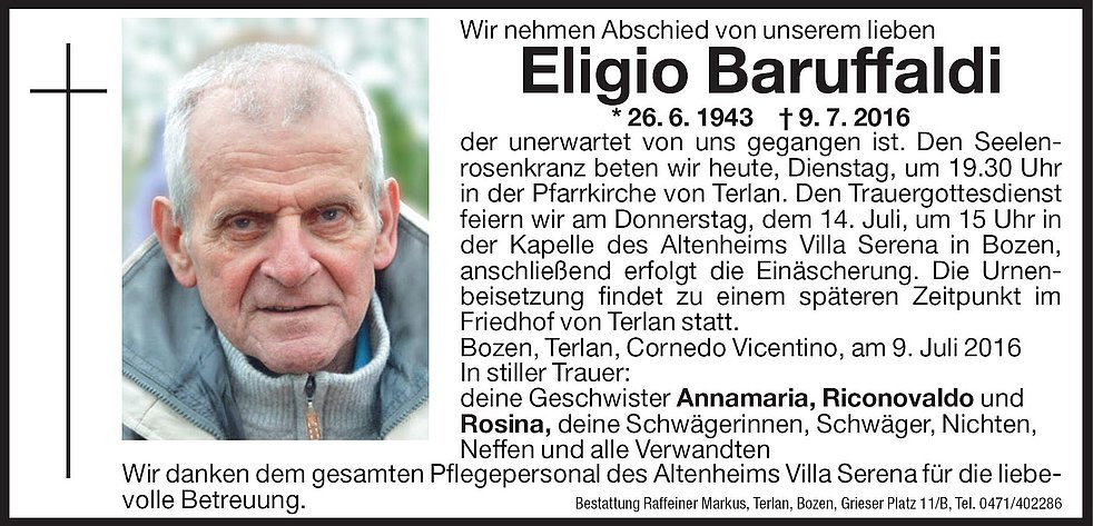 Den Trauergottesdienst feiern wir am Donnerstag, dem 14. Juli um 15 Uhr in der Kapelle des Altenheims Villa Serena in Bozen, anschließend erfolgt die Einäscherung.