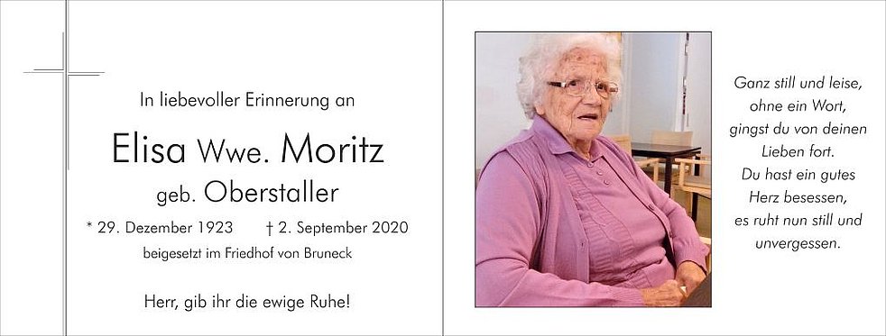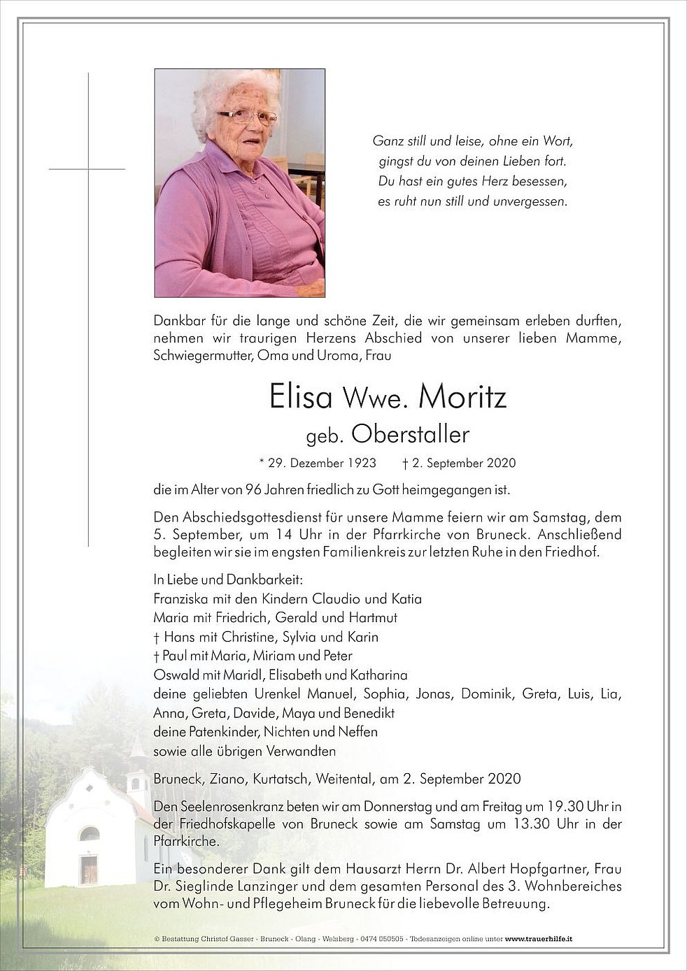 Den Abschiedsgottesdienst für unsere Mamme feiern wir am Samstag, dem 5. September, um 14 Uhr in der Pfarrkirche von Bruneck. Anschließend begleiten wir sie im engsten Familienkreis zur letzten Ruhe in den Friedhof.