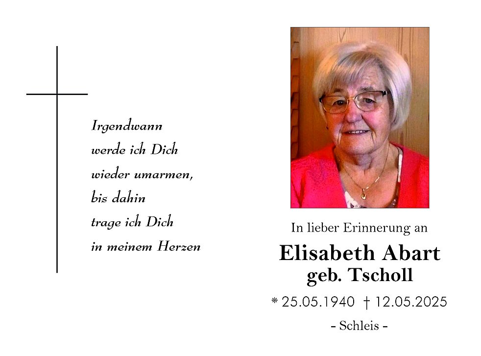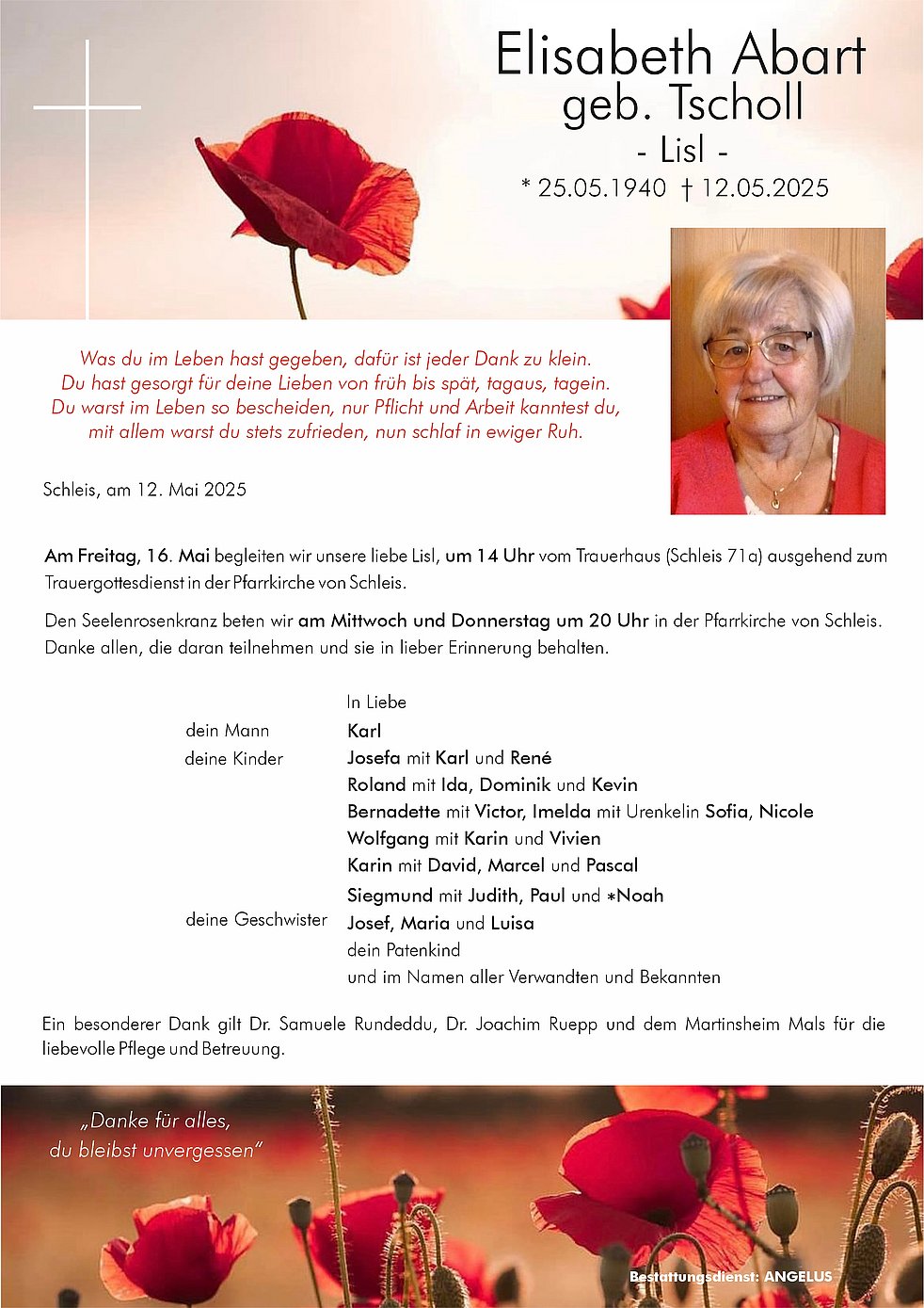 Begräbnisgottesdienst: 16.05. - 14:00 Uhr Pfarrkirche von Schleis