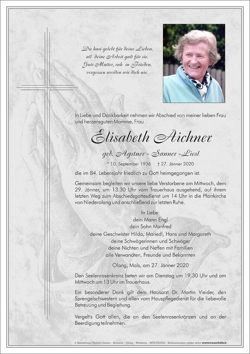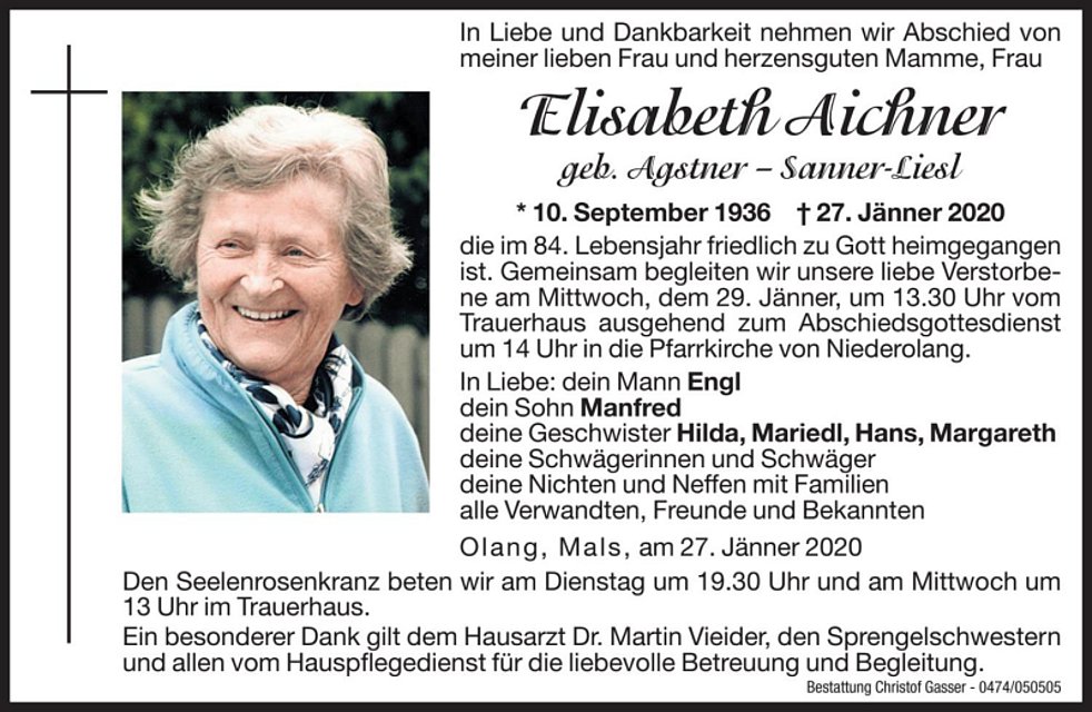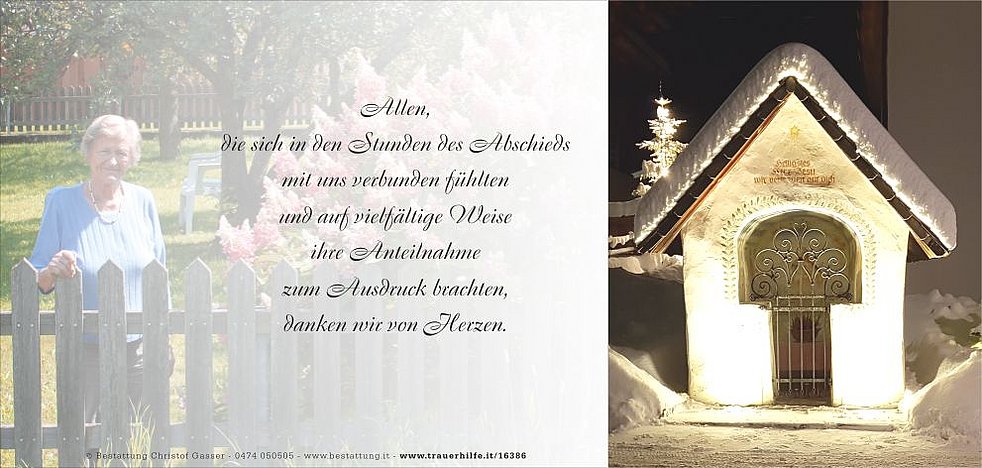 Ein besonderer Dank gilt dem Hausarzt Dr. Martin Vieider, den Sprengelschwestern und allen vom Hauspflegedienst für die liebevolle Betreuung und Begleitung.