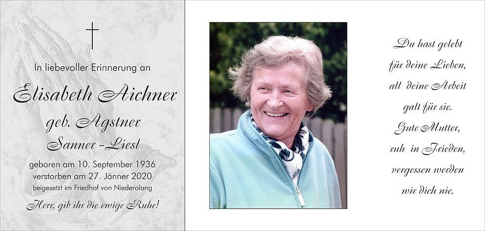 Gemeinsam begleiten wir unsere liebe Verstorbene am Mittwoch, dem 29. Jänner, um 13.30 Uhr vom Trauerhaus ausgehend, auf ihrem letzten Weg zum Abschiedsgottesdienst um 14 Uhr in die Pfarrkirche von Niederolang und anschließend zur letzten Ruhe.
