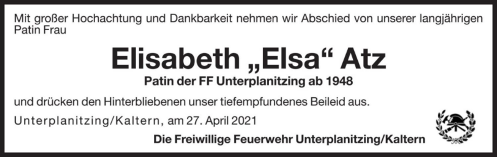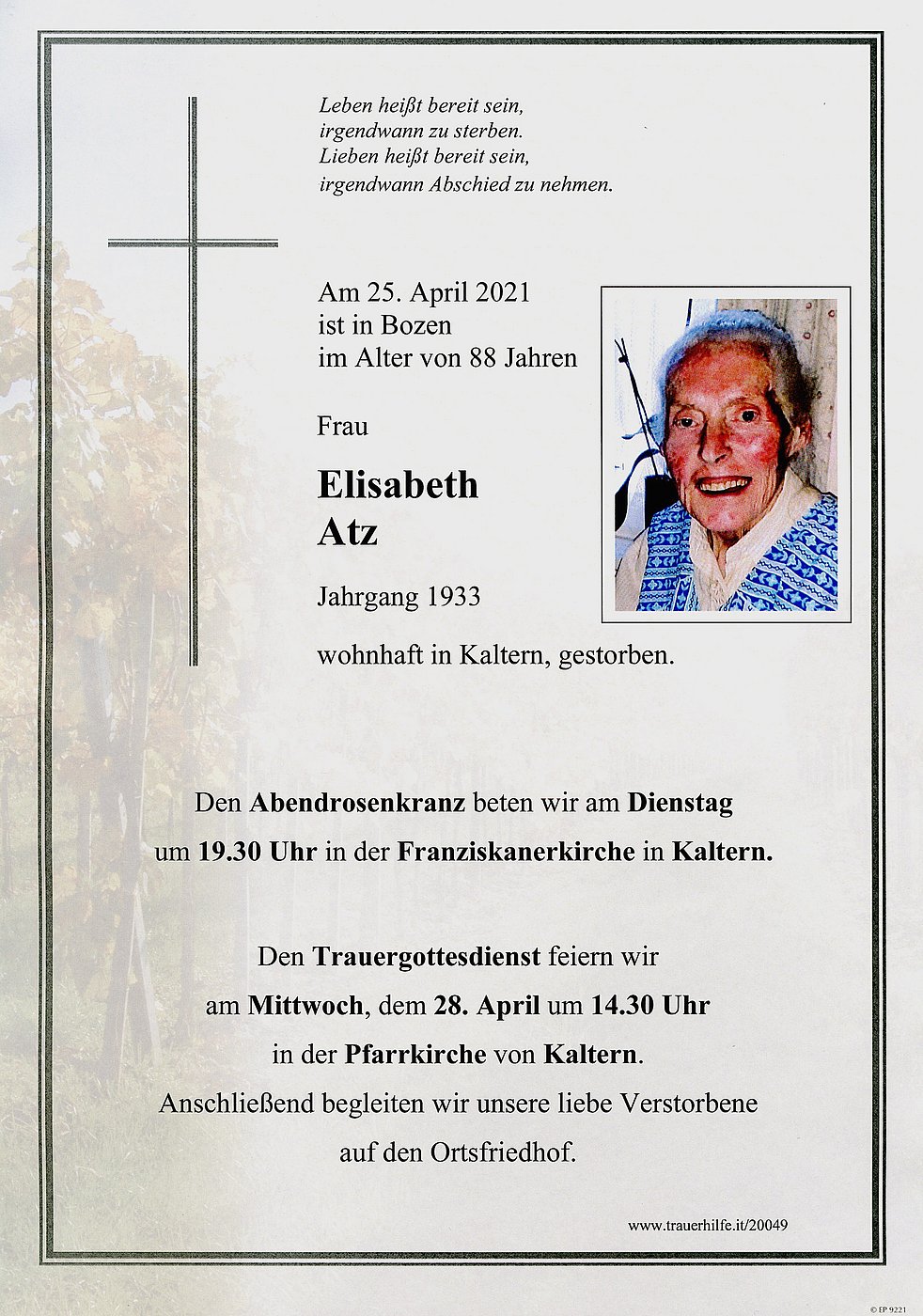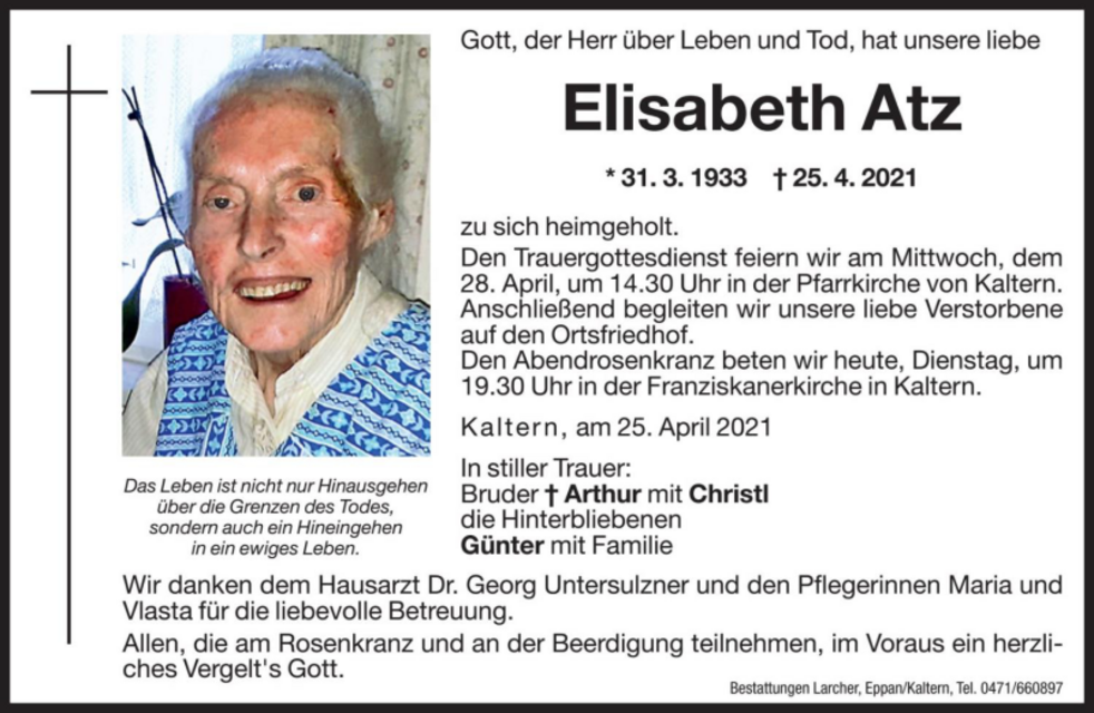 Den Trauergottesdienst feiern wir am Mittwoch, dem 28. April um 14.30 Uhr in der Pfarrkirche von Kaltern. Anschließend begleiten wir unsere liebe Verstorbene auf den Ortsfriedhof.
