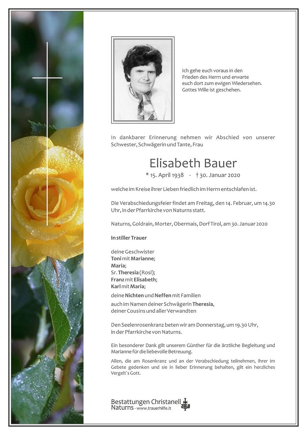 Die Verabschiedungsfeier findet am Freitag, den 14. Februar, um 14.30 Uhr, in der Pfarrkirche von Naturns statt.