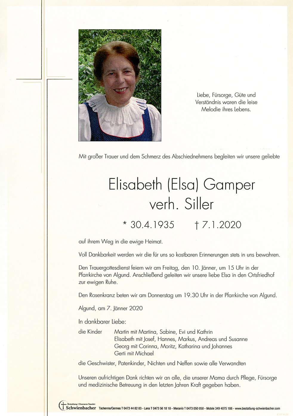 Den Trauergottesdienst feiern wir am Freitag, den 10. Jänner, um 15 Uhr in der Pfarrkirche von Algund. Anschließend geleiten wir unsere liebe Elsa in den Ortsfriedhof zu ewigen Ruhe.