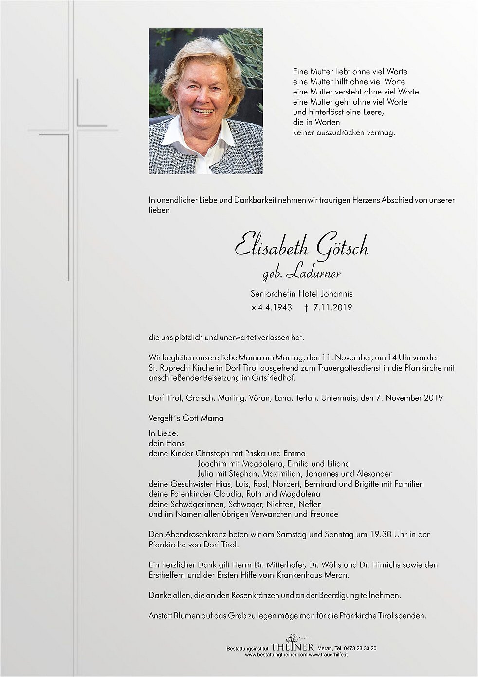 Anstatt Blumen auf das Grab zu legen möge man für die Pfarrkirche Tirol spenden.
