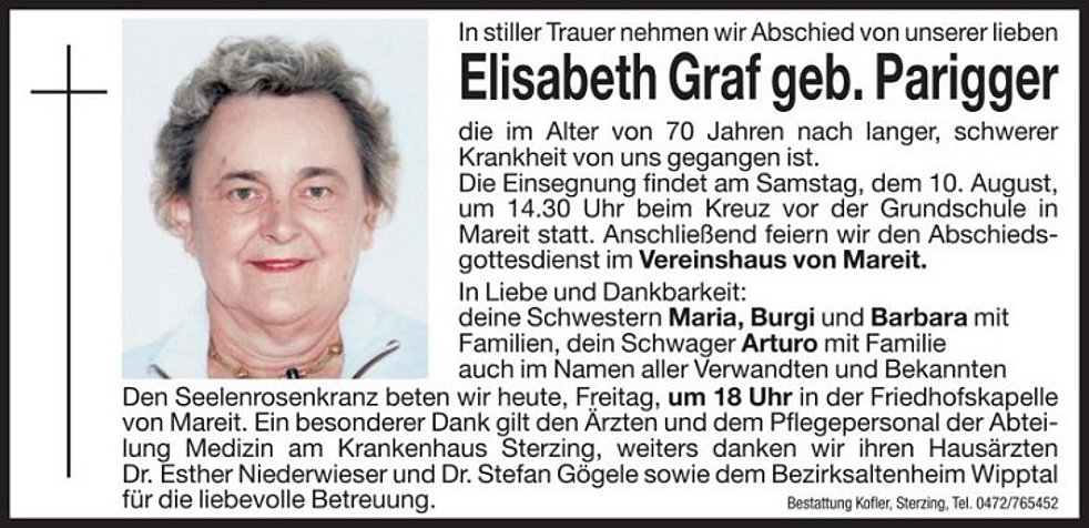 Ein besonderer Dank gilt den Ärzten und dem Pflegepersonal der Abteilung Medizin am Krankenhaus Sterzing, weiters danken wir herzlich ihren Haus-ärzten Dr. Esther Niederwieser und Dr. Stefan Gögele sowie dem Bezirksaltenheim Wipptal für die liebevolle Betreuung.