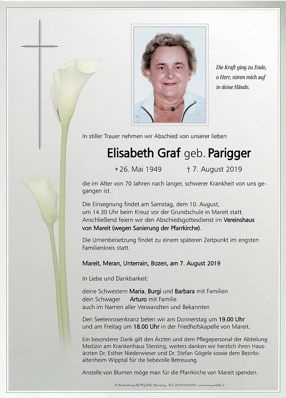 Anstelle von Blumen möge man für die Pfarrkirche von Mareit spenden.