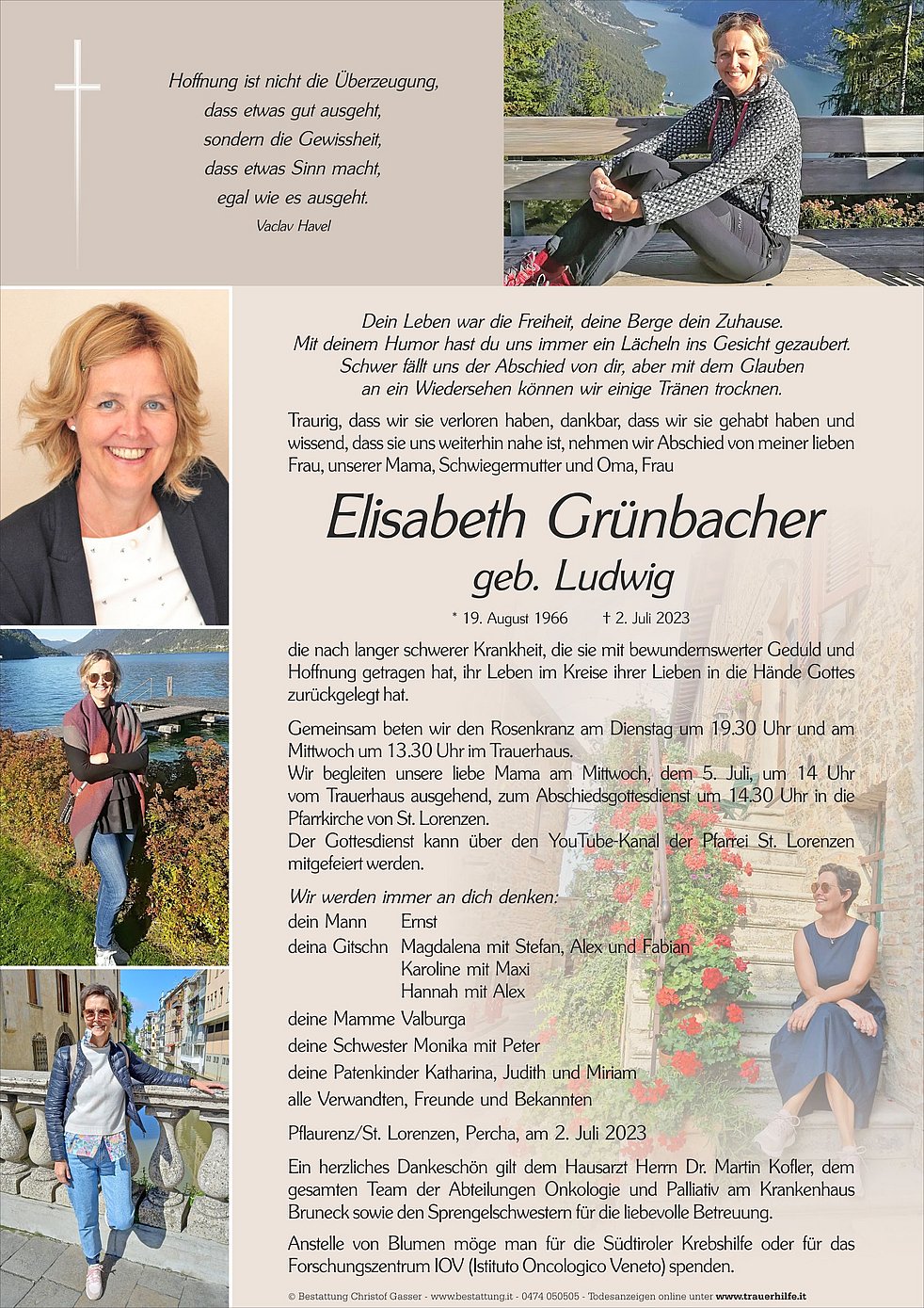 Anstelle von Blumen möge man für die Südtiroler Krebshilfe oder für das Forschungszentrum IOV (Istituto Oncologico Veneto) spenden.