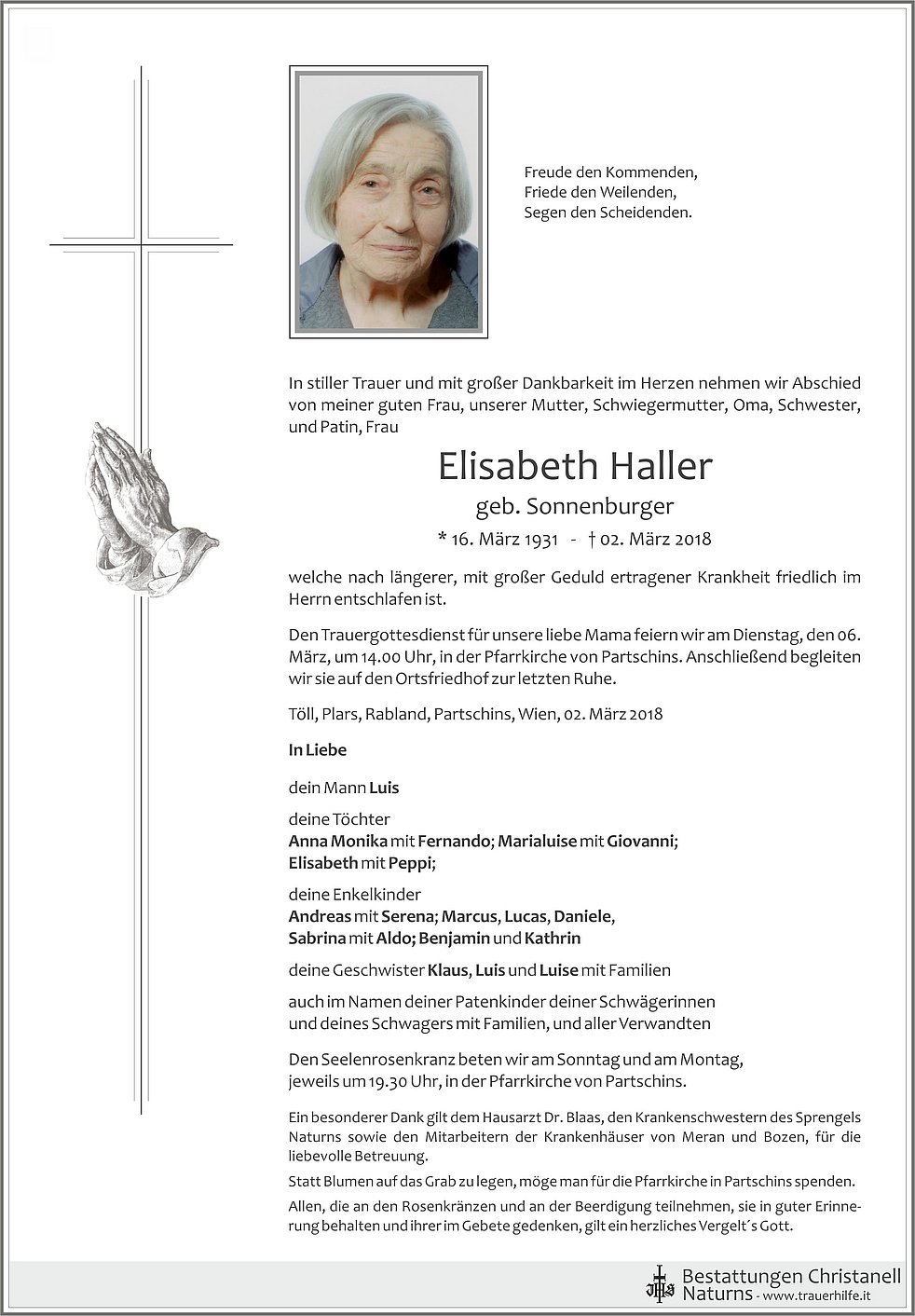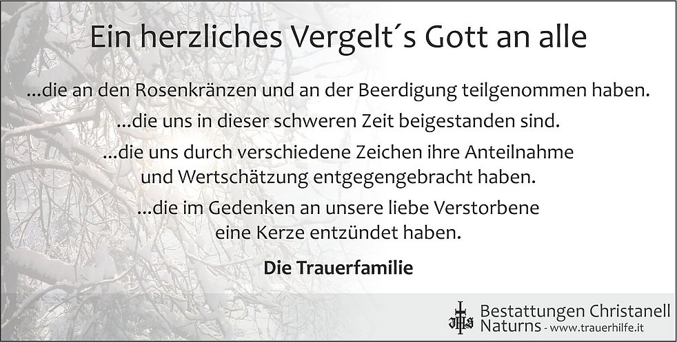 Den Trauergottesdienst für unsere liebe Mama feiern wir am Dienstag, den 06. März, um 14.00 Uhr, in der Pfarrkirche von Partschins. Anschließend begleiten wir sie auf den Ortsfriedhof zur letzten Ruhe.