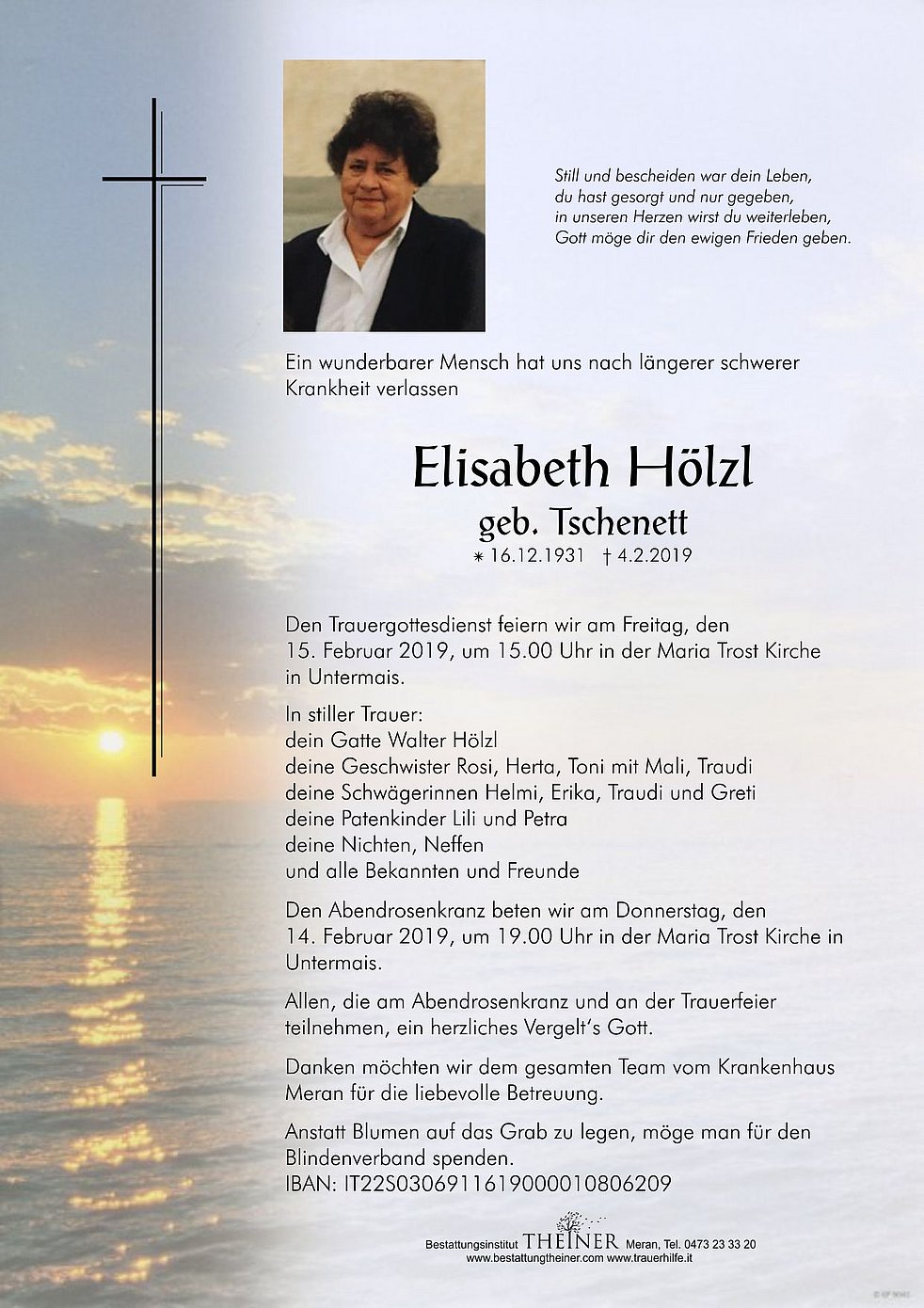 Den Trauergottesdienst feiern wir am Freitag, den 15. Februar 2019, um 15.00 Uhr in der Maria Trost Kirche in Untermais.