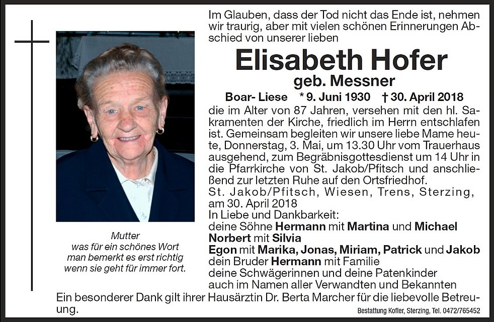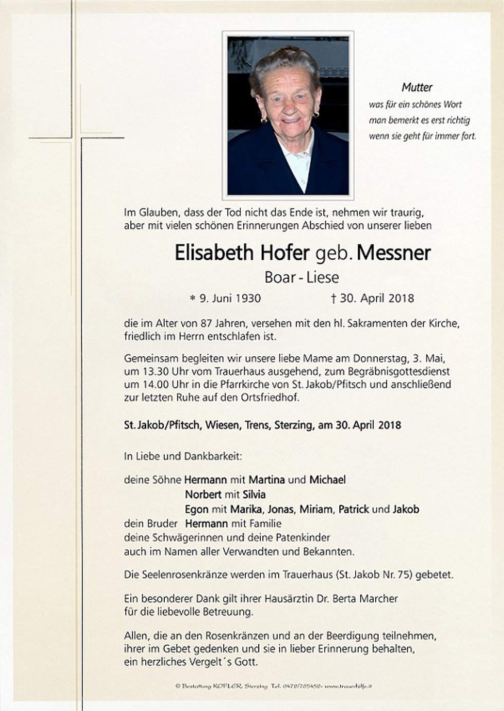 Gemeinsam begleiten wir unsere liebe Mame am Donnerstag, 3. Mai, um 13.30 Uhr vom Trauerhaus ausgehend, zum Begräbnisgottesdienst um 14.00 Uhr in die Pfarrkirche von St. Jakob/Pfitsch und anschließend zur letzten Ruhe auf den Ortsfriedhof.