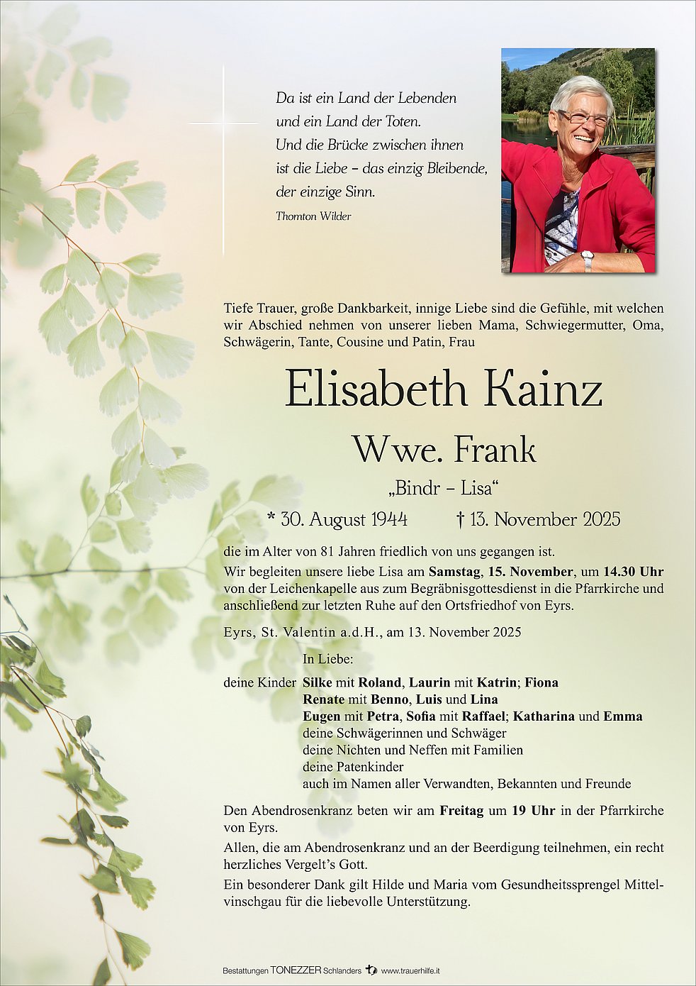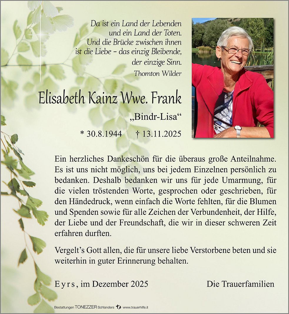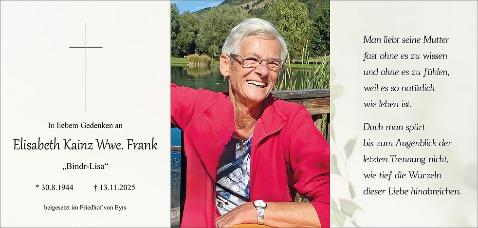 Wir begleiten unsere liebe Lisa am Samstag, 15. November, um 14.30 Uhr von der Leichenkapelle aus zum Begräbnisgottesdienst in die Pfarrkirche und anschließend zur letzten Ruhe auf den Ortsfriedhof von Eyrs.