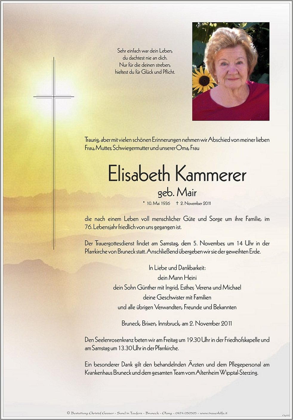 Der Trauergottesdienst findet am Samstag, dem 5. November, um 14 Uhr in der Pfarrkirche von Bruneck statt. Anschließend übergeben wir sie der geweihten Erde.