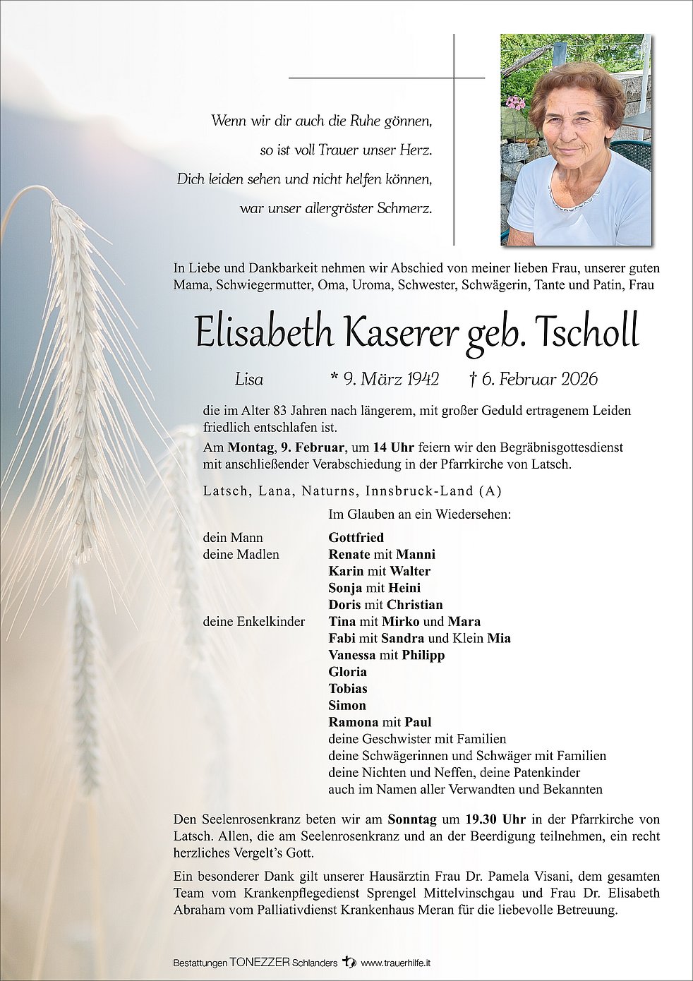 Am Montag, 9. Februar, um 14 Uhr feiern wir den Begräbnisgottesdienst mit anschließender Verabschiedung in der Pfarrkirche von Latsch.