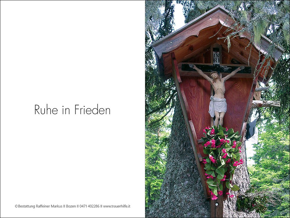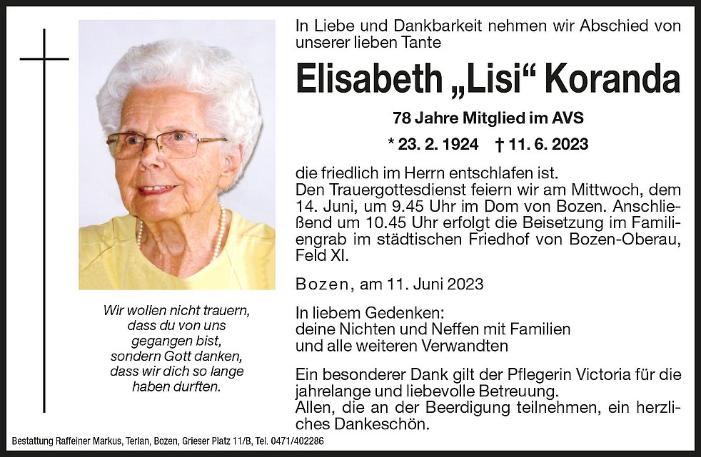 Den Trauergottesdienst feiern wir am Mittwoch, dem 14. Juni, um 9.45 Uhr im Dom von Bozen. Anschließend um 10.45 Uhr erfolgt die Beisetzung im Familiengrab im städtischen Friedhof von Bozen-Oberau, Feld XI.