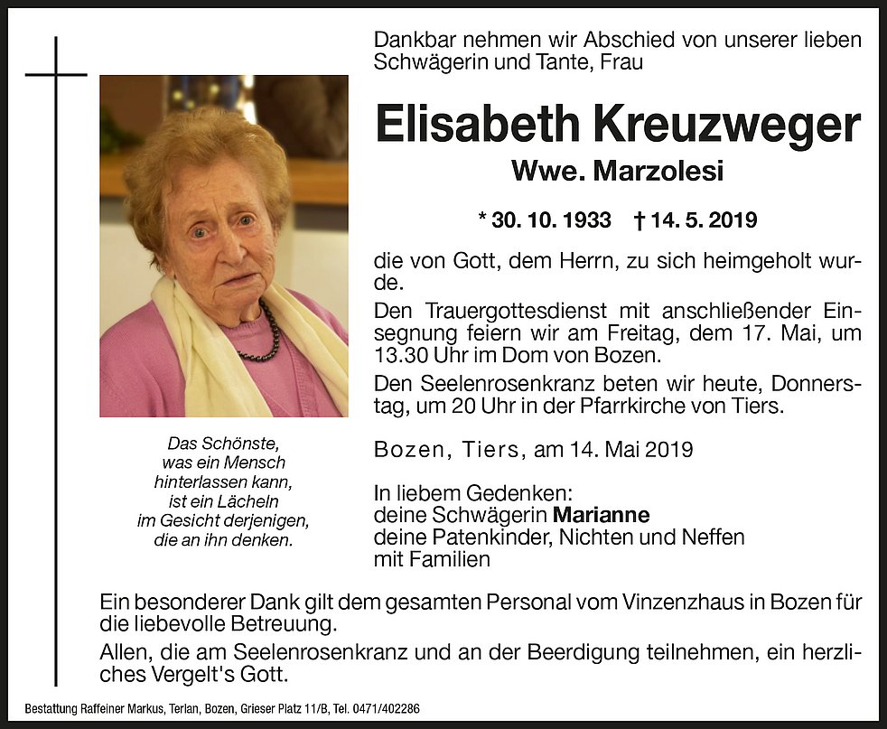 Den Trauergottesdienst mit anschließender Einsegnung feiern wir am Freitag, dem 17. Mai, um 13.30 Uhr im Dom von Bozen.