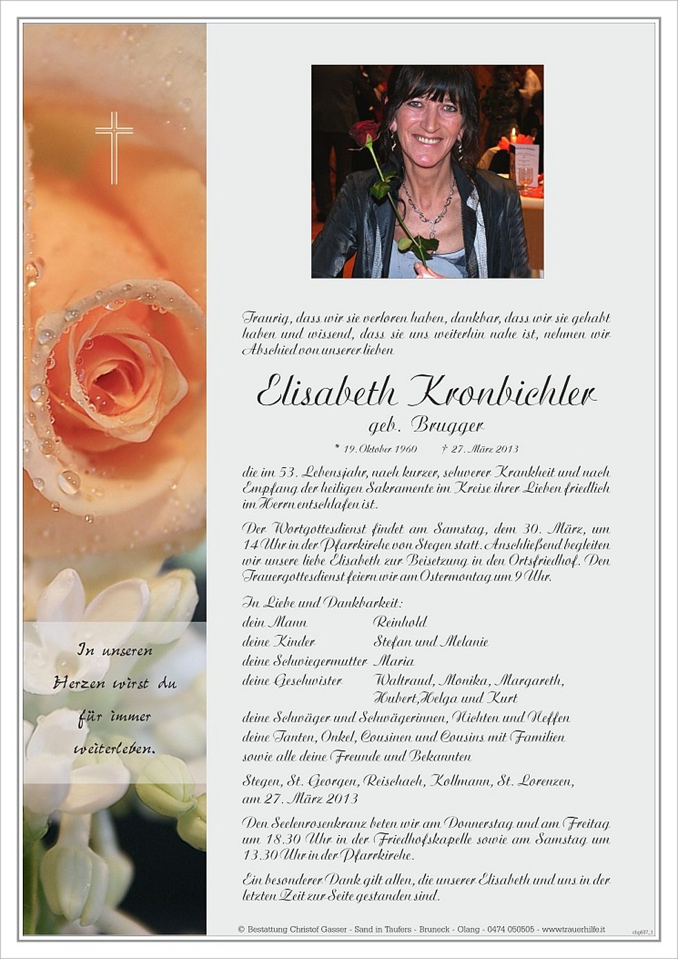 14 Uhr in der Pfarrkirche von Stegen statt. Anschließend begleiten wir unsere liebe Elisabeth zur Beisetzung in den Ortsfriedhof. Den Trauergottesdienst feiern wir am Ostermontag um 9 Uhr.