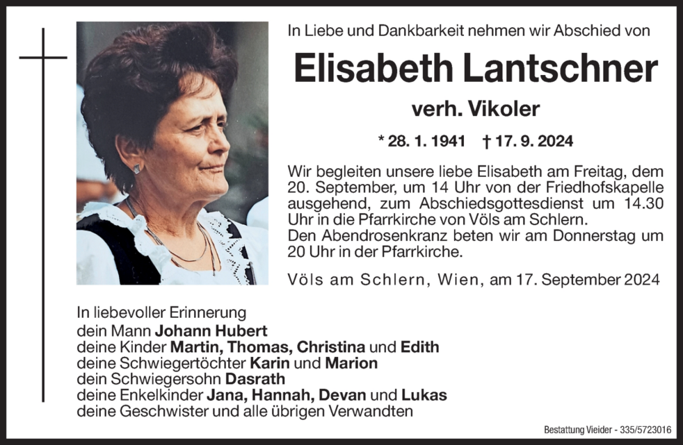 Wir begleiten unsere liebe Elisabeth am Freitag, dem 20. September, um 14 Uhr von der Friedhofskapelle ausgehend zum Abschiedsgottesdienst um 14.30 Uhr in die Pfarrkirche von Völs am Schlern.
