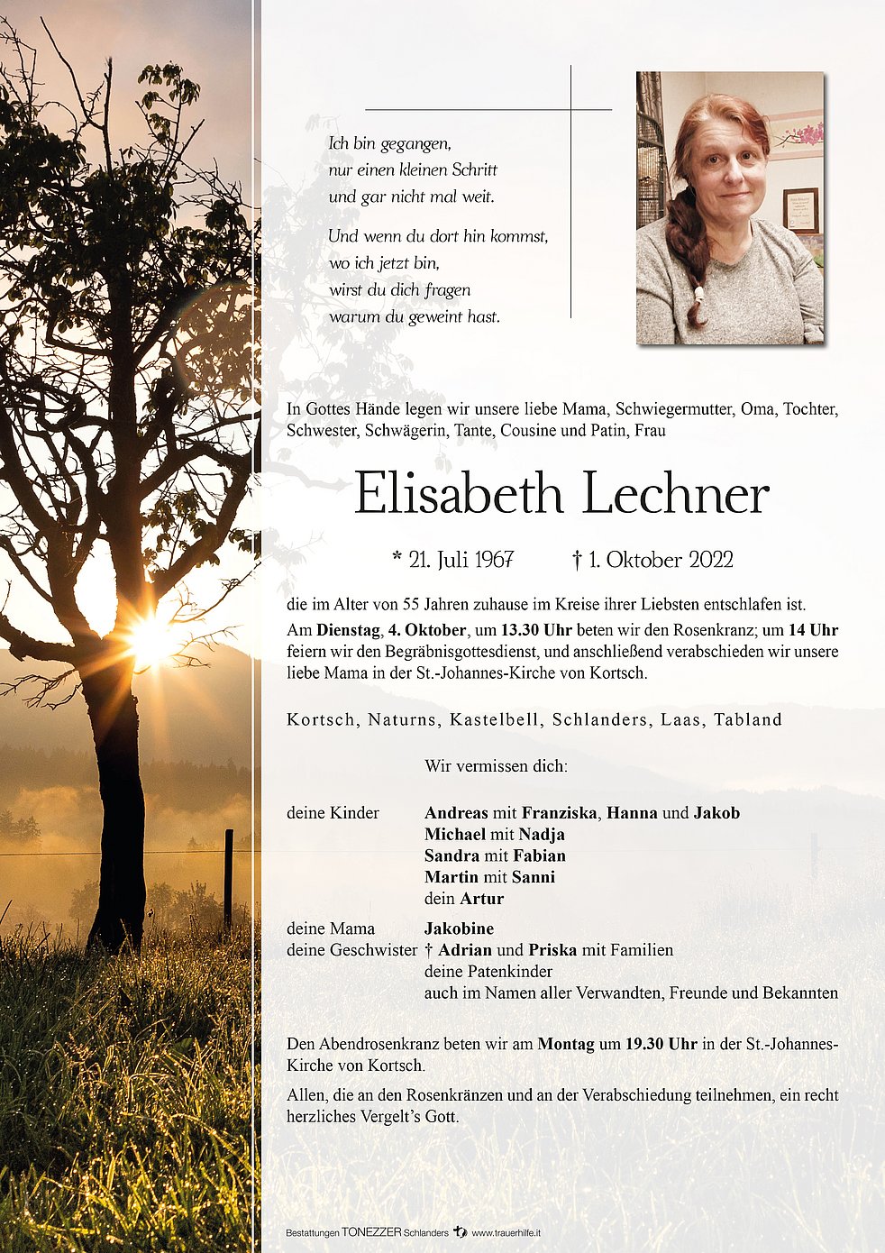 Am Dienstag, 4. Oktober, um 13.30 Uhr beten wir den Rosenkranz; um 14 Uhr feiern wir den Begräbnisgottesdienst, und anschließend verabschieden wir unsere liebe Mama in der St.-Johannes-Kirche von Kortsch.