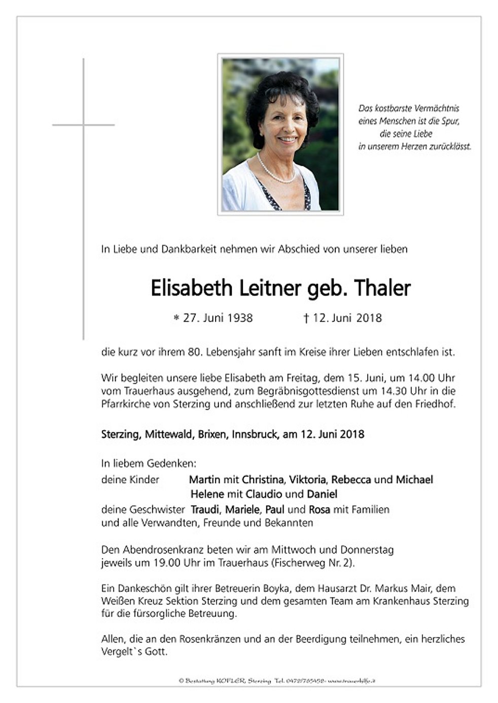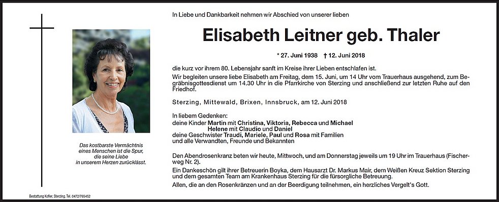 Wir begleiten unsere liebe Elisabeth am Freitag, dem 15. Juni, um 14.00 Uhr vom Trauerhaus ausgehend, zum Begräbnisgottesdienst um 14.30 Uhr in die Pfarrkirche von Sterzing und anschließend zur letzten Ruhe auf den Friedhof.