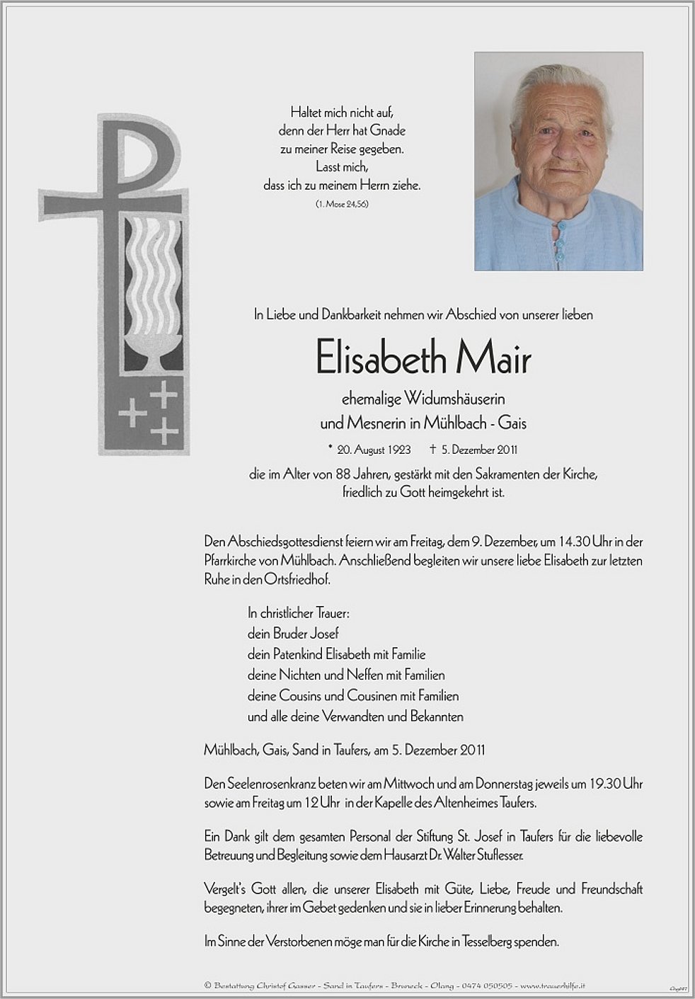 Den Abschiedsgottesdienst feiern wir am Freitag, dem 9. Dezember, um 14.30 Uhr in der Pfarrkirche von Mühlbach. Anschließend begleiten wir unsere liebe Elisabeth zur letzten Ruhe in den Ortsfriedhof.
