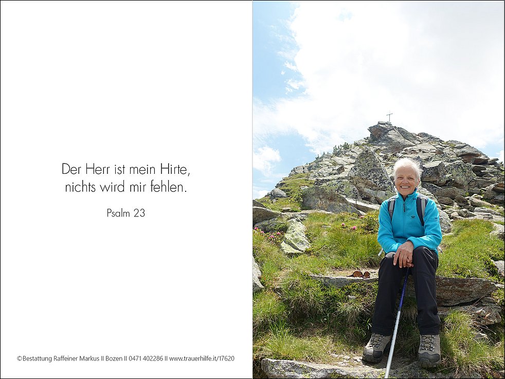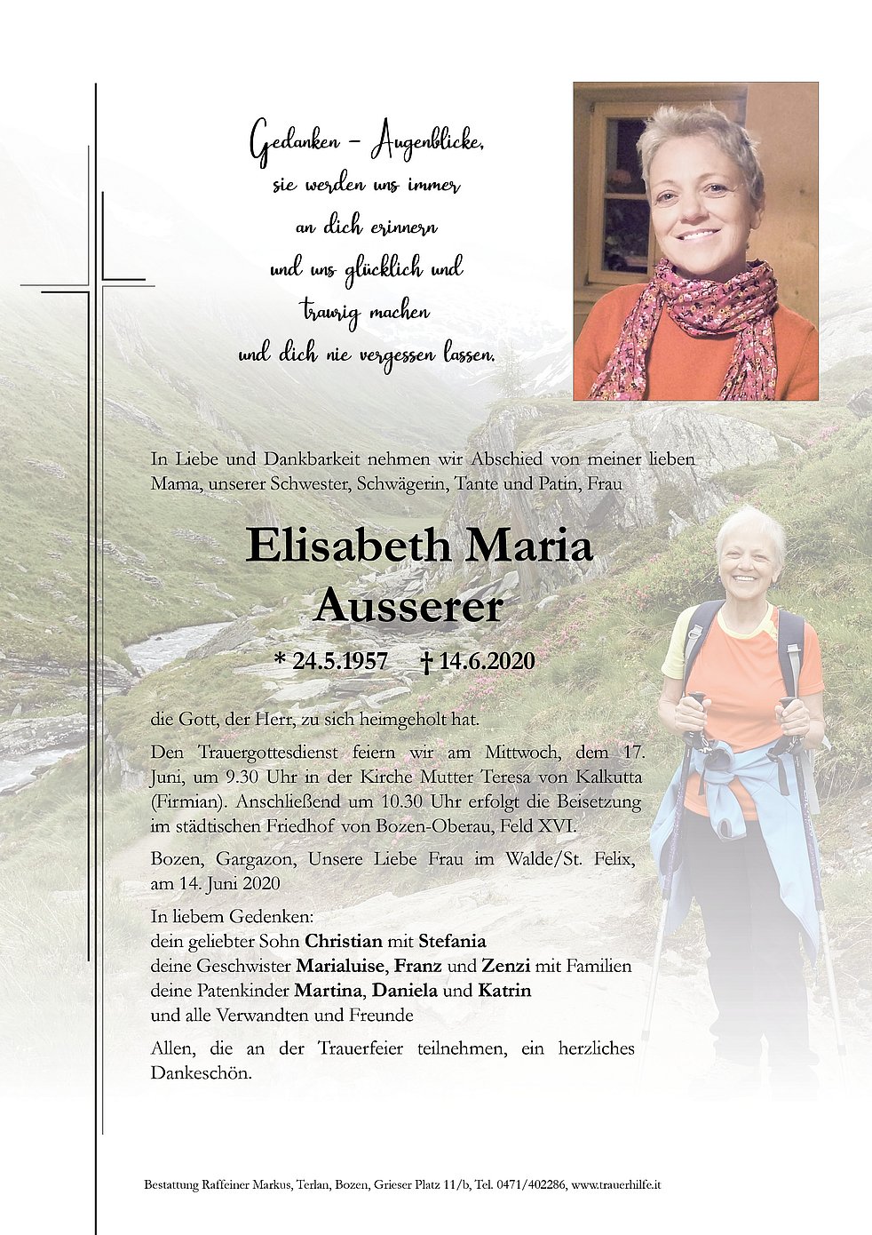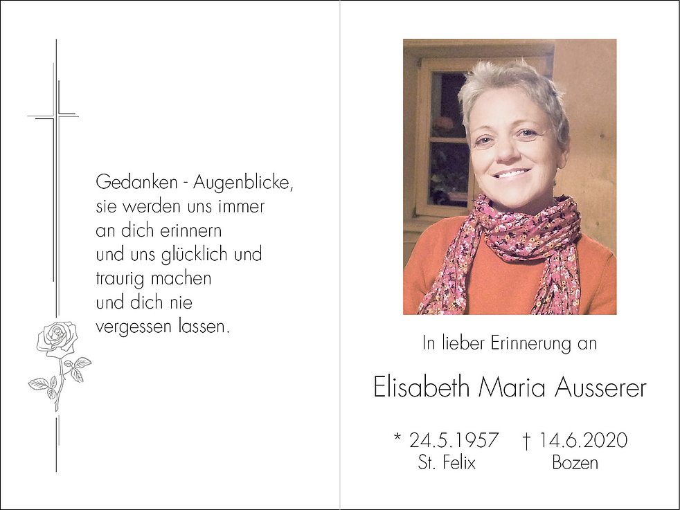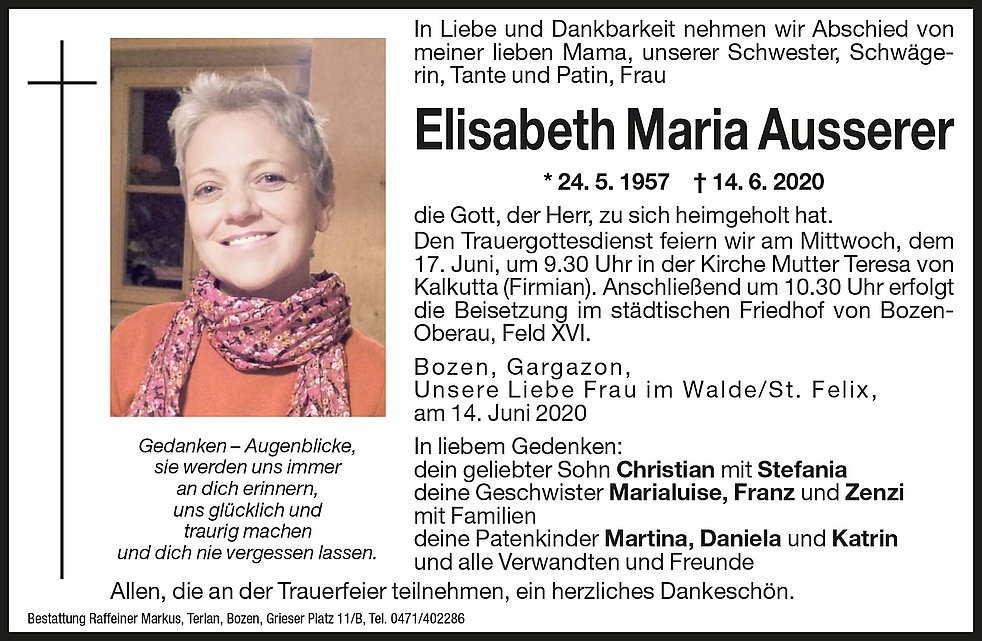 Den Trauergottesdienst feiern wir am Mittwoch, dem 17. Juni, um 9.30 Uhr in der Kirche Mutter Teresa von Kalkutta (Firmian). Anschließend um 10.30 Uhr erfolgt die Beisetzung im städtischen Friedhof von Bozen-Oberau, Feld XVI.