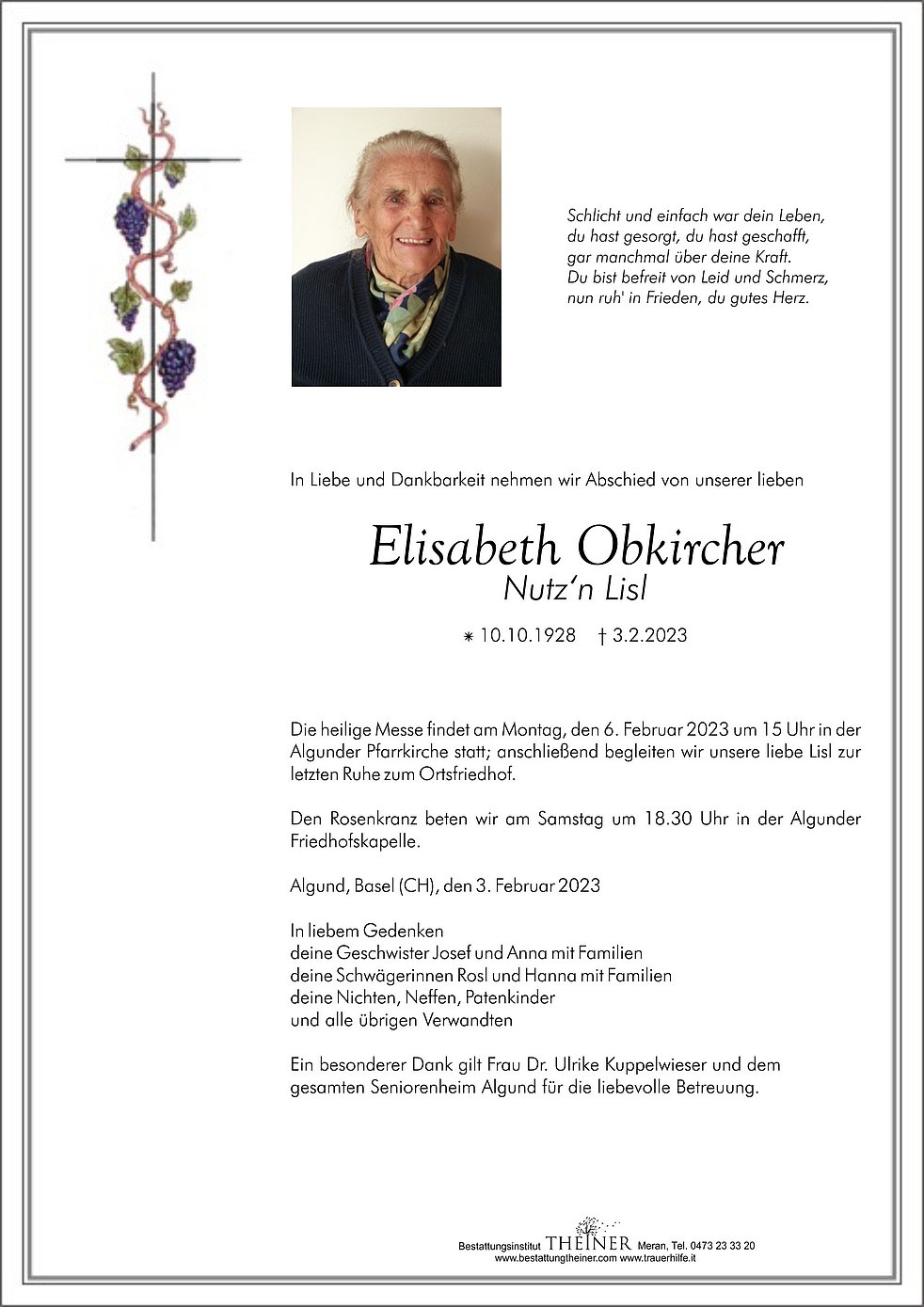 Die heilige Messe findet am Montag, den 6. Februar 2023 um 15 Uhr in der Algunder Pfarrkirche statt; anschließend begleiten wir unsere liebe Lisl zur letzten Ruhe zum Ortsfriedhof.