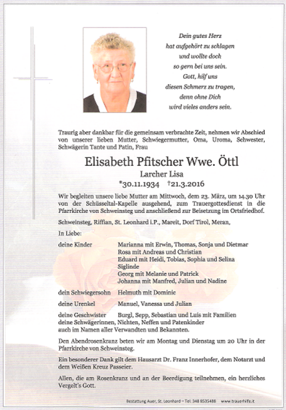 Ein besonderer Dank gilt dem Hausarzt Dr. Franz Innerhofer, dem Notarzt und dem Weißen Kreuz Passeier.