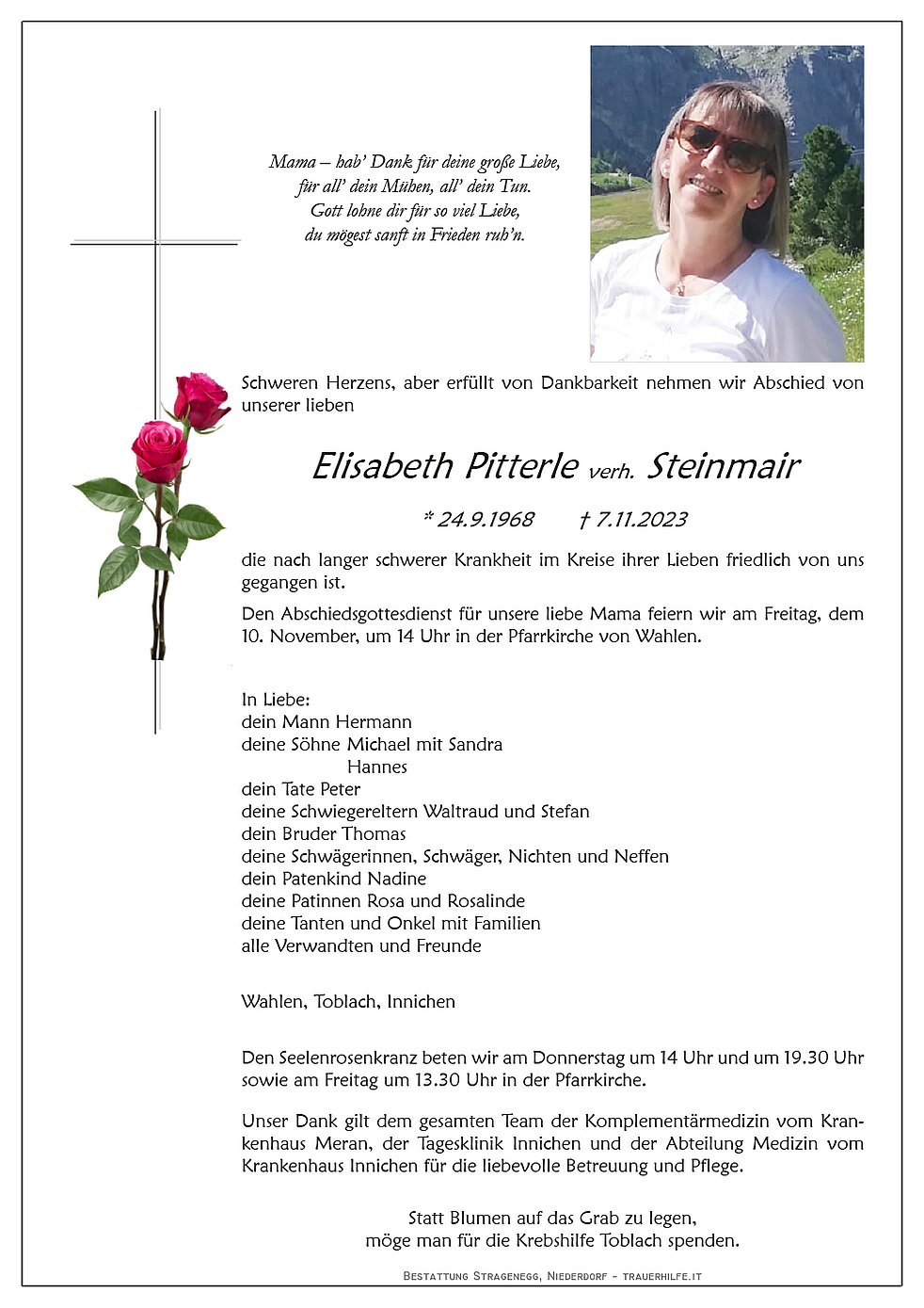 Liebe Fam. Steinmair, wir wünschen euch viel Kraft in dieser schweren Zeit. Wir sind in Gedanken bei Euch. Das Küchenteam des KH- Innichen
