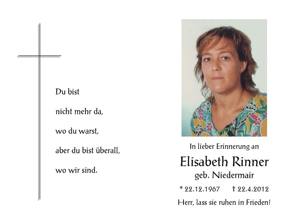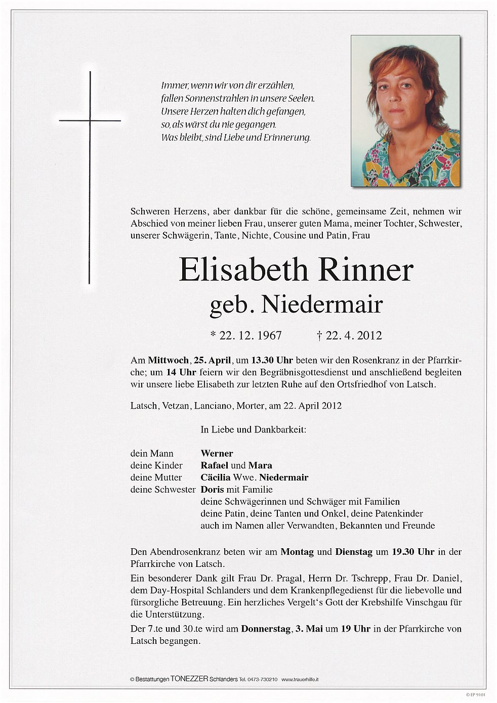 Am Mittwoch, 25. April, um 13.30 Uhr beten wir den Rosenkranz in der Pfarrkirche; um 14 Uhr feiern wir den Begräbnisgottesdienst und anschließend begleiten wir unsere liebe Elisabeth zur letzten Ruhe auf den Ortsfriedhof von Latsch.