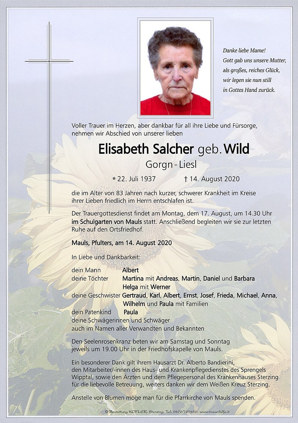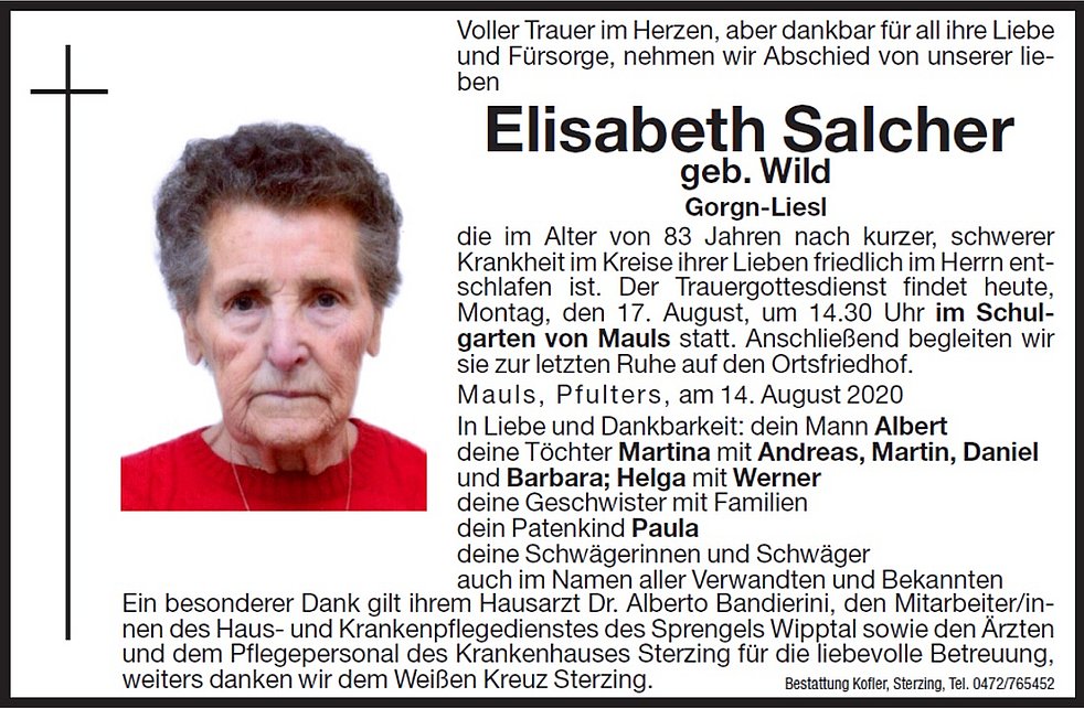 Der Trauergottesdienst findet am Montag, dem 17. August, um 14.30 Uhr im Schulgarten von Mauls statt. Anschließend begleiten wir sie zur letzten Ruhe auf den Ortsfriedhof.