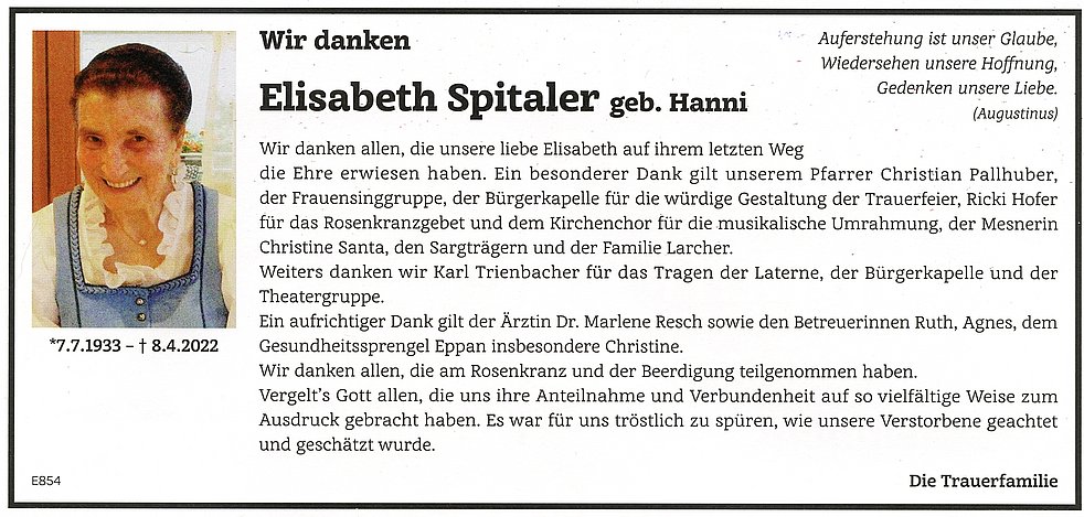 Wir danken der Hausärztin Dr. Marlene Resch, dem Krankenpflegedienst, besonders Christine Warasin, sowie Agnes und Ruth für die liebevolle Betreuung.