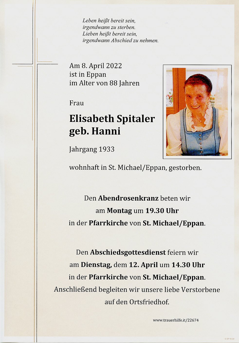 Den Abschiedsgottesdienst feiern wir am Dienstag, dem 12. April um 14.30 Uhr in der Pfarrkirche von St. Michael/Eppan. Anschließend begleiten wir unsere liebe Verstorbene auf den Ortsfriedhof.