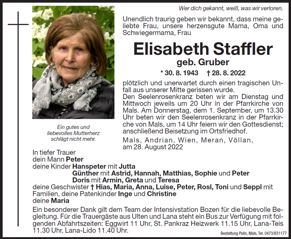 Für die Trauergäste aus Ulten und Lana steht ein Bus zur Verfügung