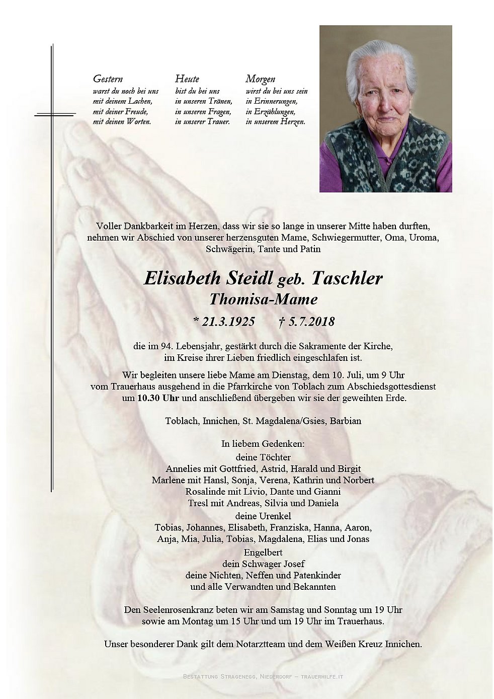 Wir begleiten unsere liebe Mame am Dienstag, dem 10. Juli, um 9 Uhr vom Trauerhaus ausgehend in die Pfarrkirche von Toblach zum Abschiedsgottesdienst um 10.30 Uhr und anschließend übergeben wir sie der geweihten Erde.