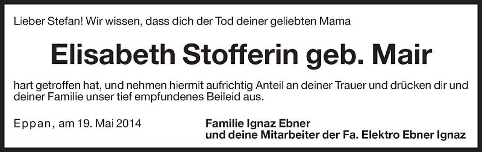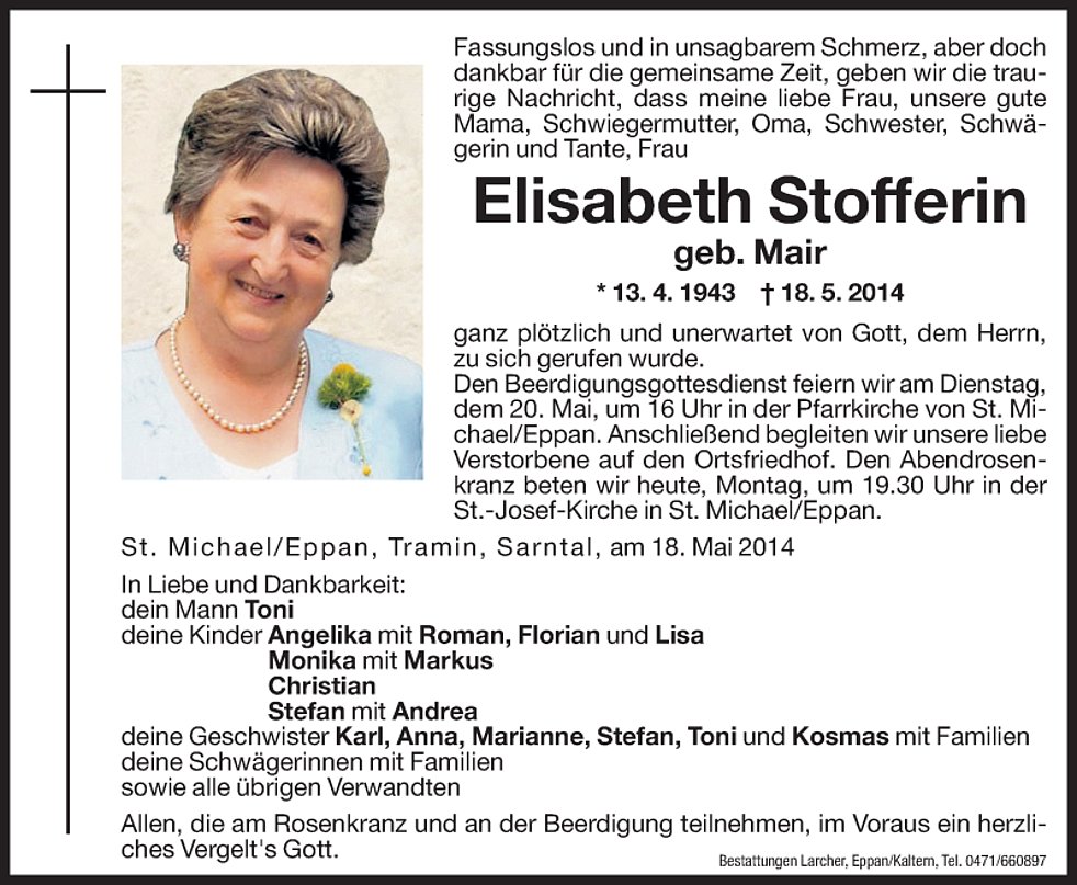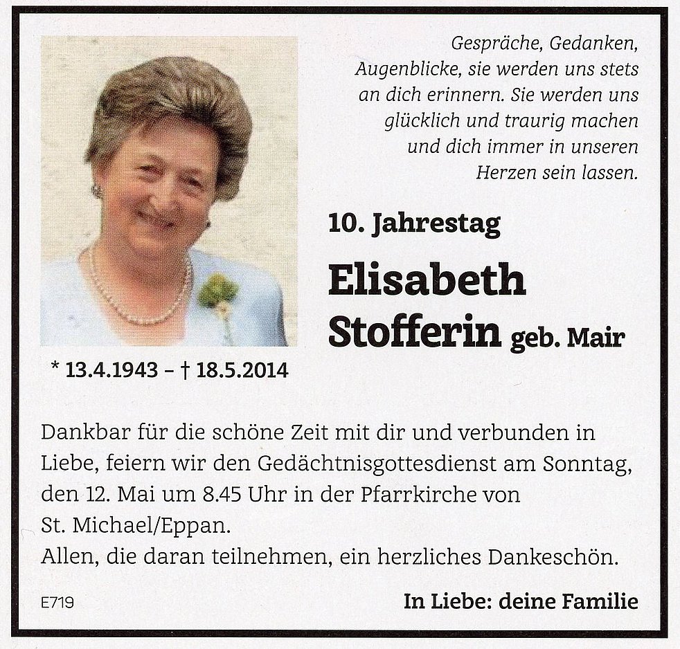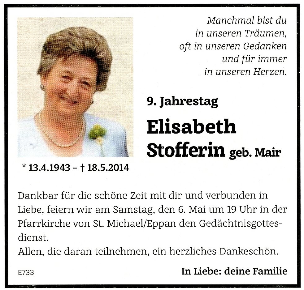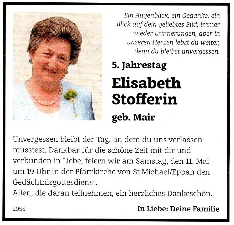 Den Beerdigungsgottesdienst feiern wir am Dienstag, den 20. Mai um 16 Uhr in der Pfarrkirche von St. Michael/Eppan. Anschließend begleiten wir unsere liebe Verstorbene zum Ortsfriedhof.