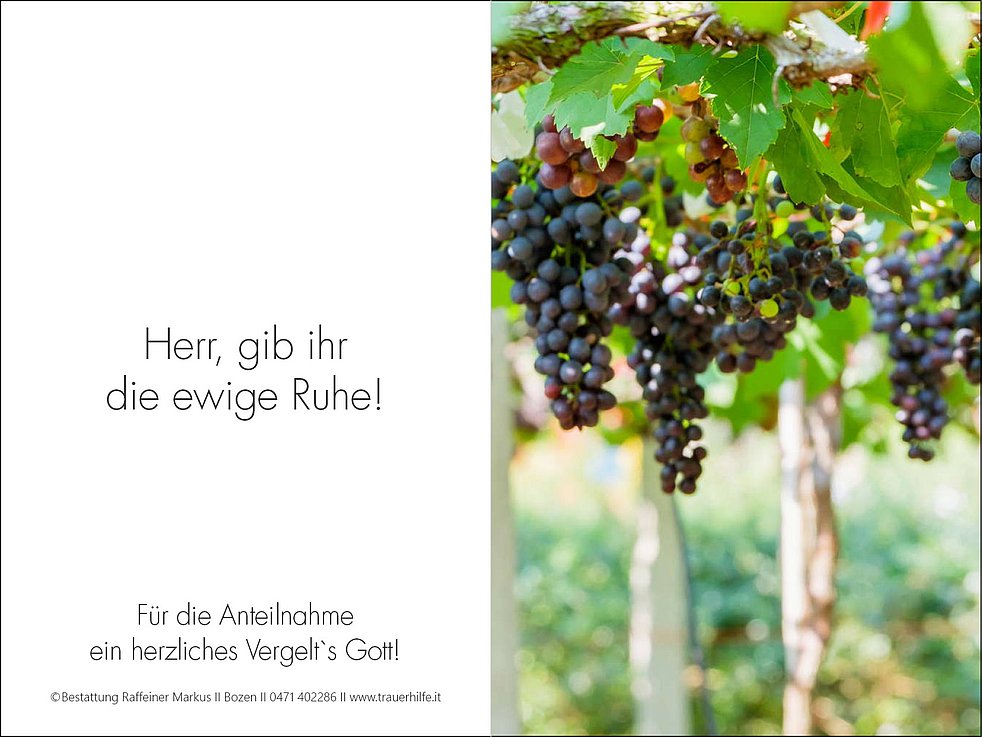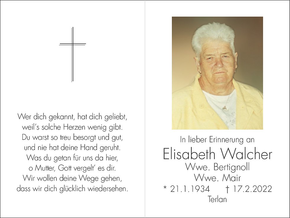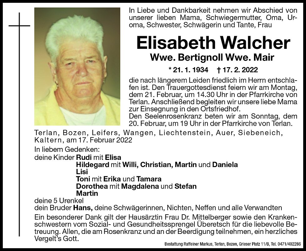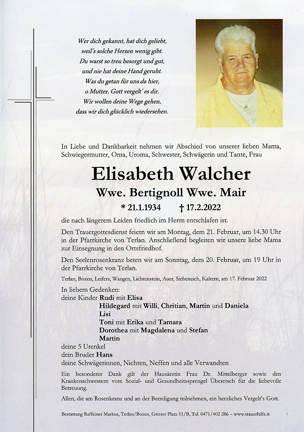 Den Trauergottesdienst feiern wir am Montag, dem 21. Februar, um 14.30 Uhr in der Pfarrkirche von Terlan. Anschließend begleiten wir unsere liebe Mama zur Einsegnung in den Ortsfriedhof.