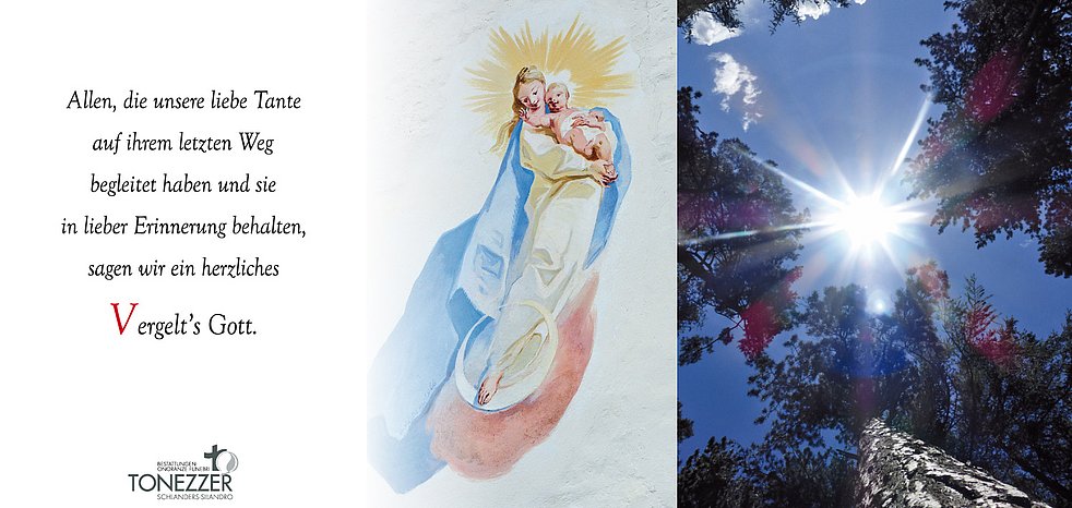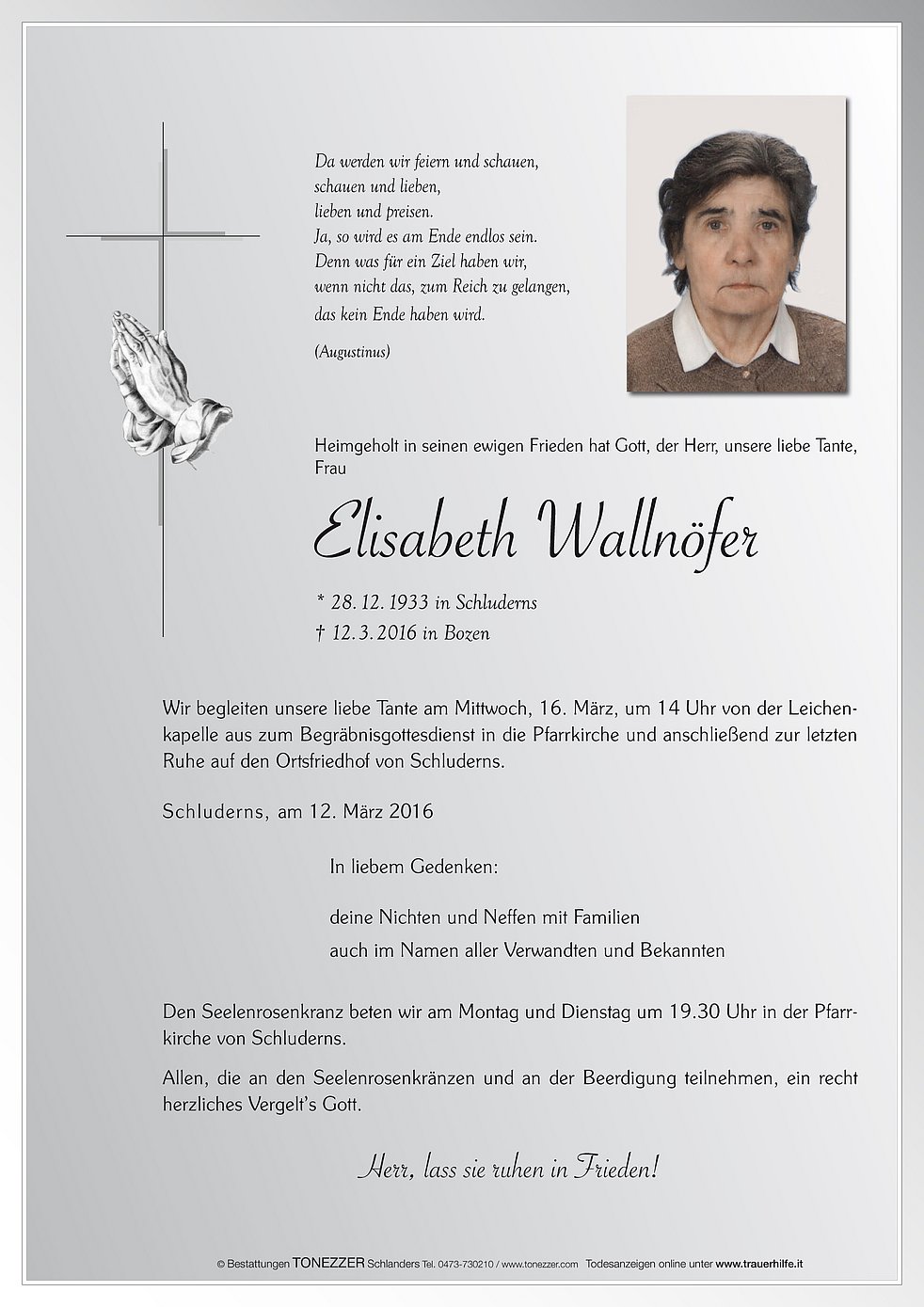 Wir begleiten unsere liebe Tante am Mittwoch, 16. März, um 14 Uhr von der Leichenkapelle aus zum Begräbnisgottesdienst in die Pfarrkirche und anschließend zur letzten Ruhe auf den Ortsfriedhof von Schluderns.