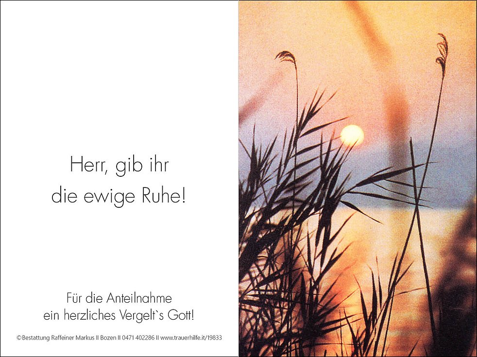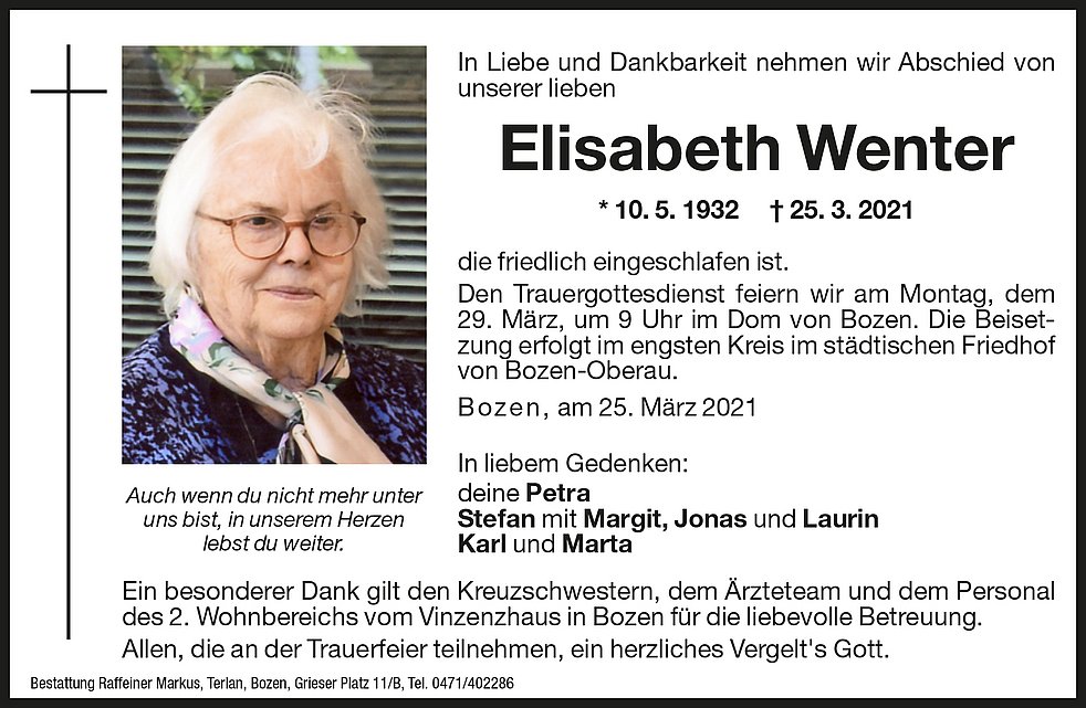 Den Trauergottesdienst feiern wir am Montag, dem 29. März, um 9 Uhr im Dom von Bozen. Die Beisetzung erfolgt im engsten Kreis im städtischen Friedhof von Bozen-Oberau.